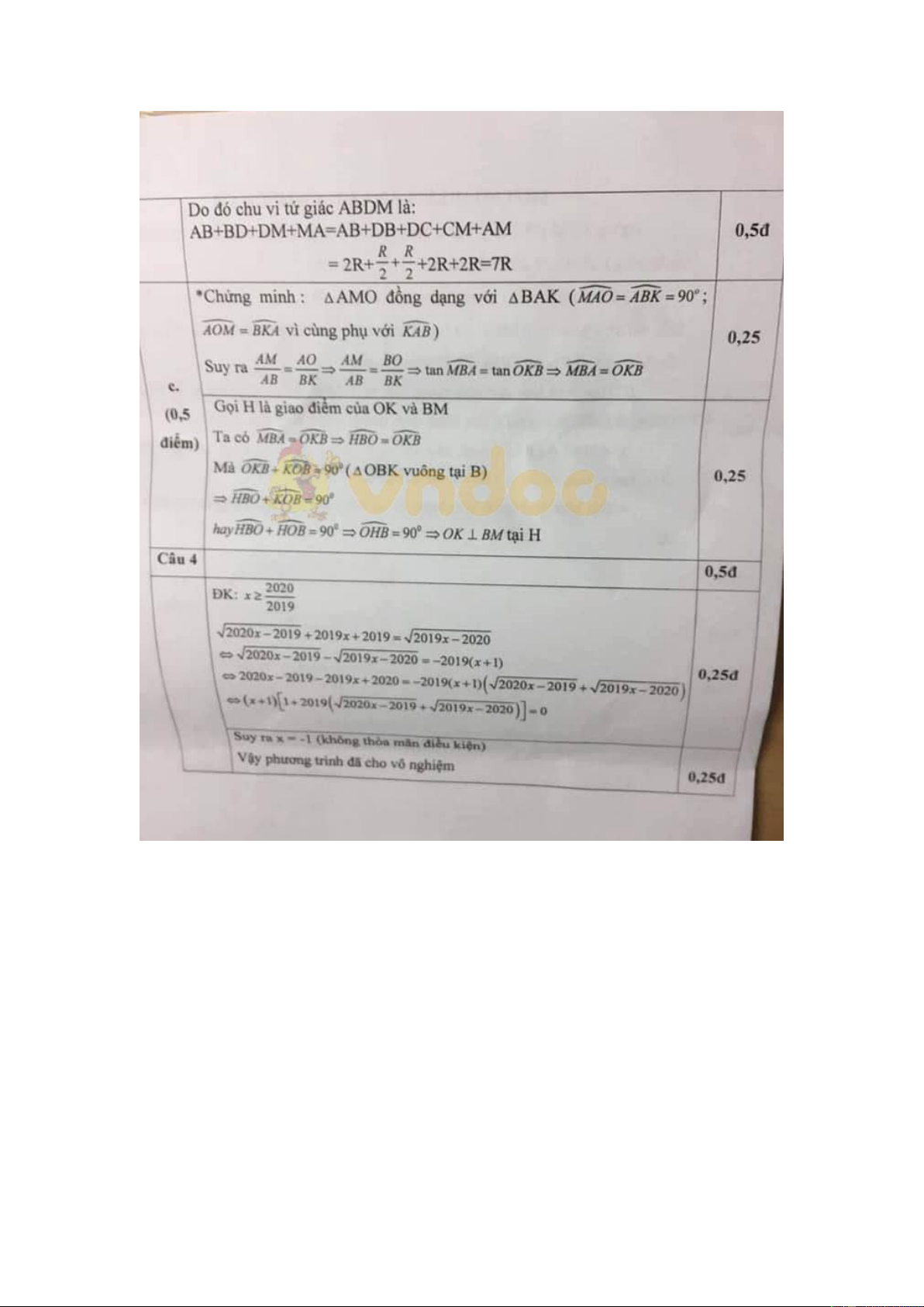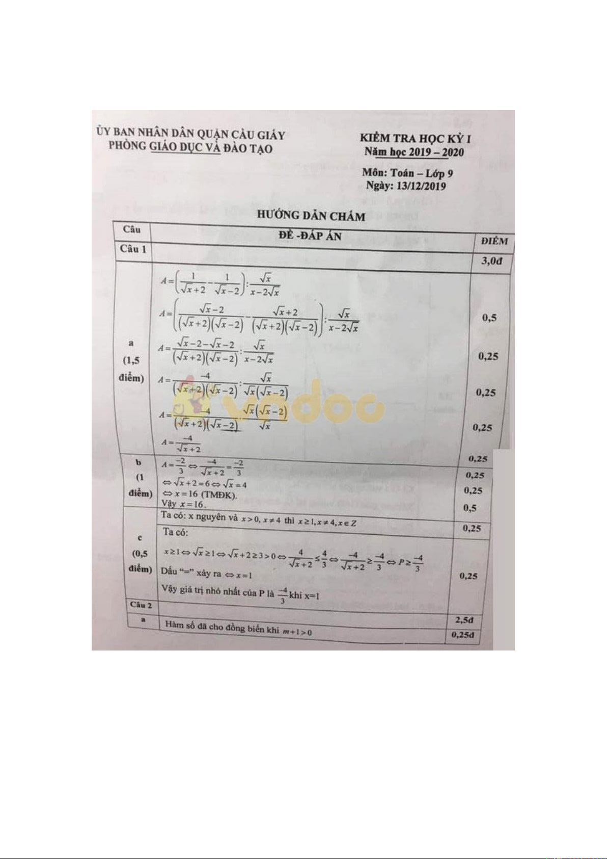 Đáp án đề thi học kì 1 lớp 9 môn Toán Phòng GD&ĐT quận Cầu Giấy năm học 2019 - 2020