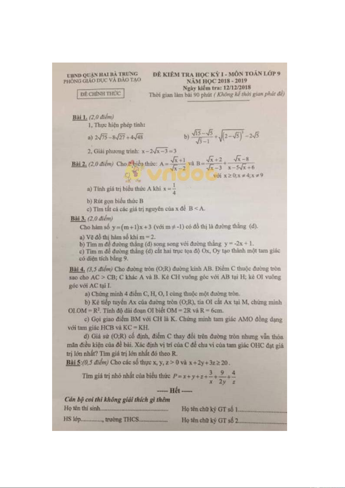 Đề thi học kì 1 lớp 9 môn Toán Phòng GD&ĐT quận Hai Bà Trưng năm học 2018 - 2019