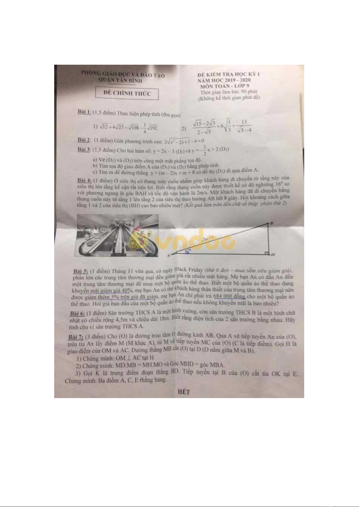 Đề thi học kì 1 lớp 9 môn Toán Phòng GD&ĐT Quận Tân Bình năm học 2019 - 2020