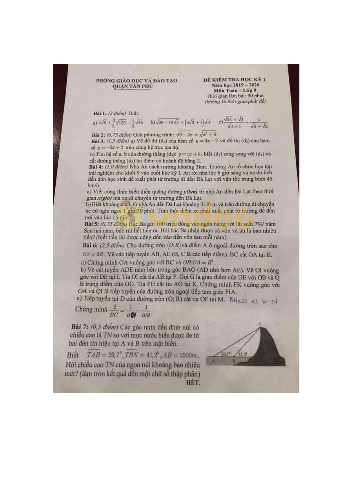 Đề thi học kì 1 lớp 9 môn Toán Phòng GD&ĐT quận Tân Phú năm học 2019 - 2020