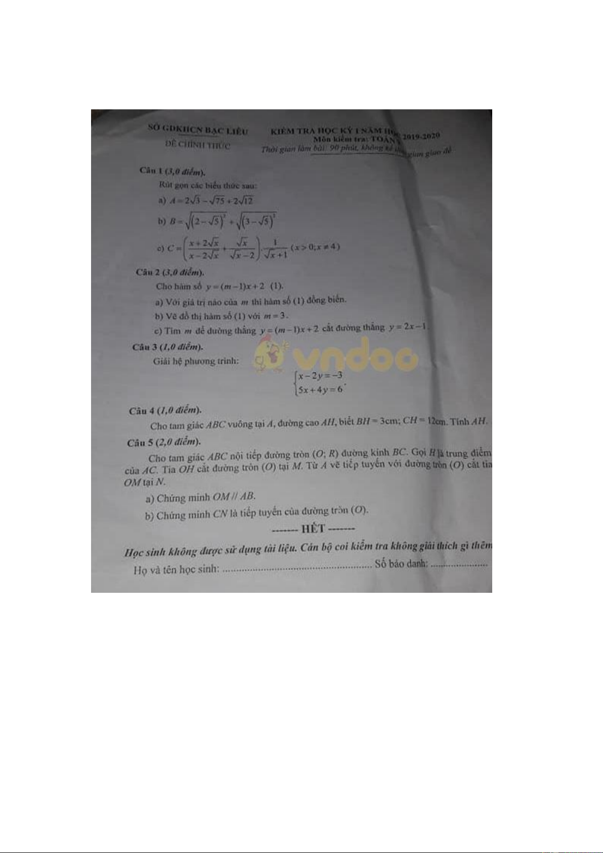 Đề thi học kì 1 lớp 9 môn Toán Sở GDKHCN Bạc Liêu năm học 2019 - 2020