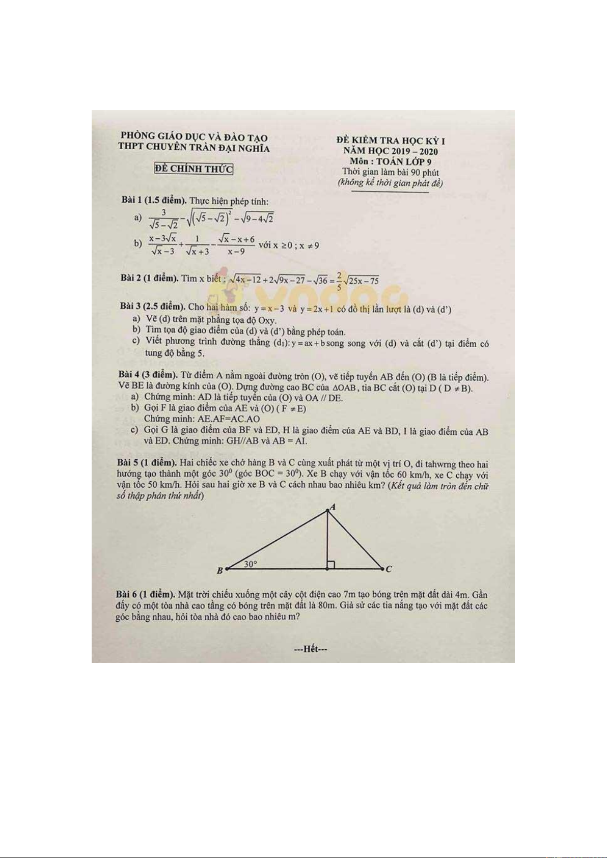 Đề thi học kì 1 lớp 9 môn Toán Trường THPT Chuyên Trần Đại Nghĩa năm học 2019 - 2020
