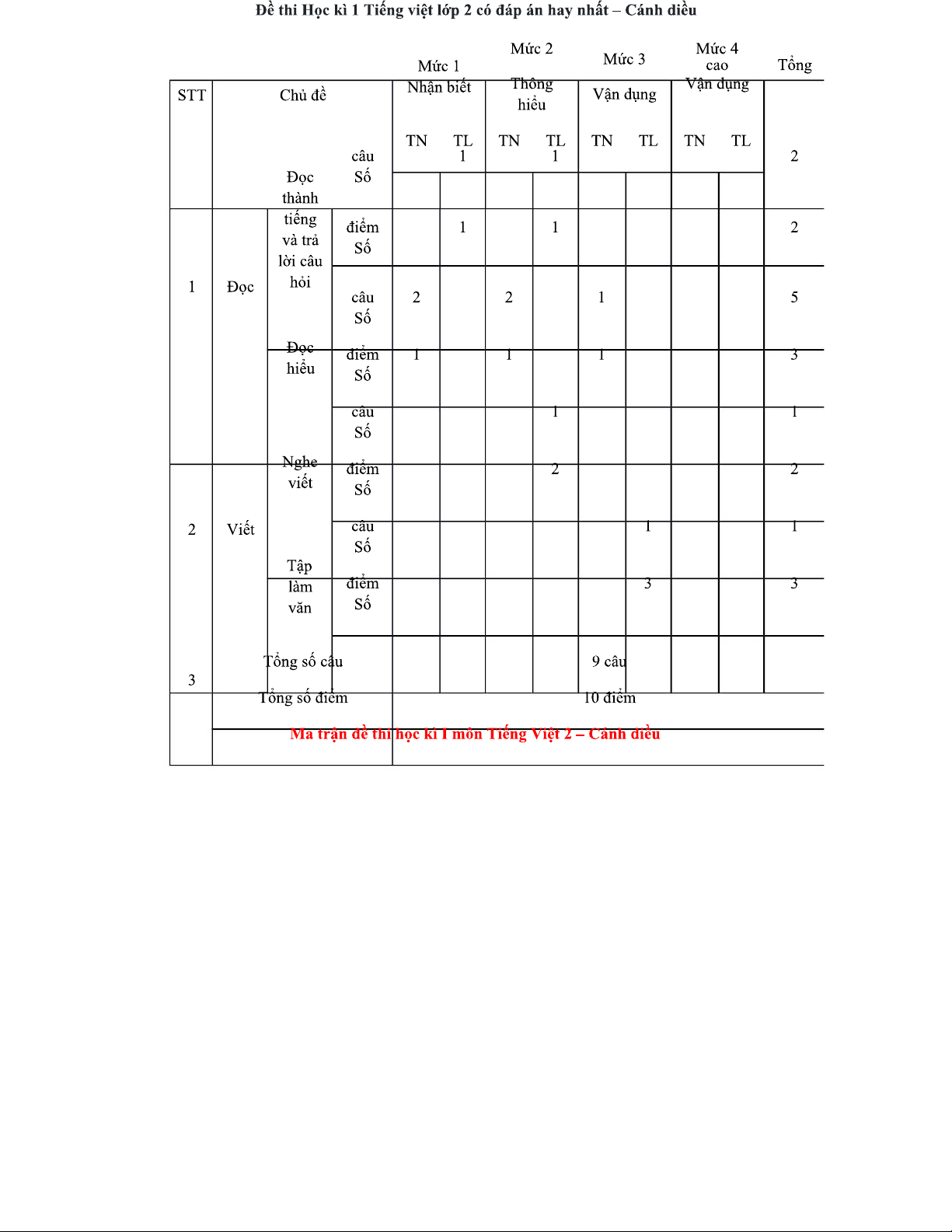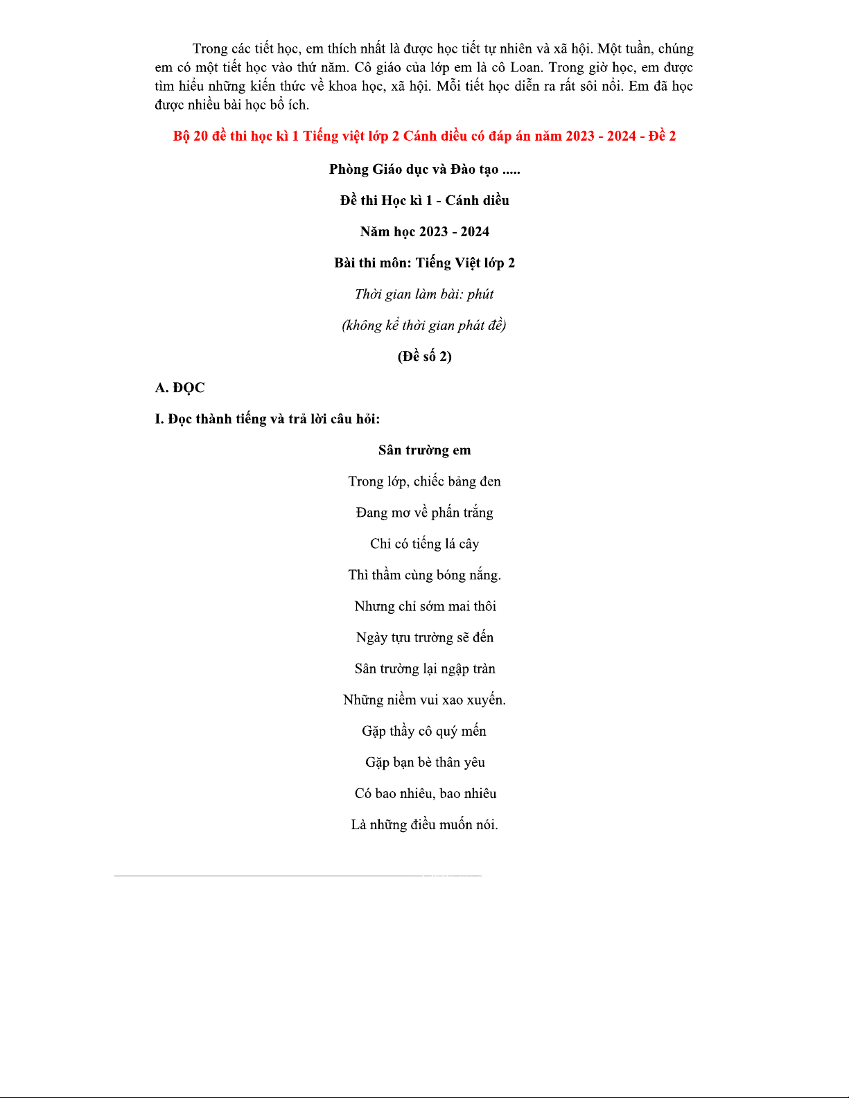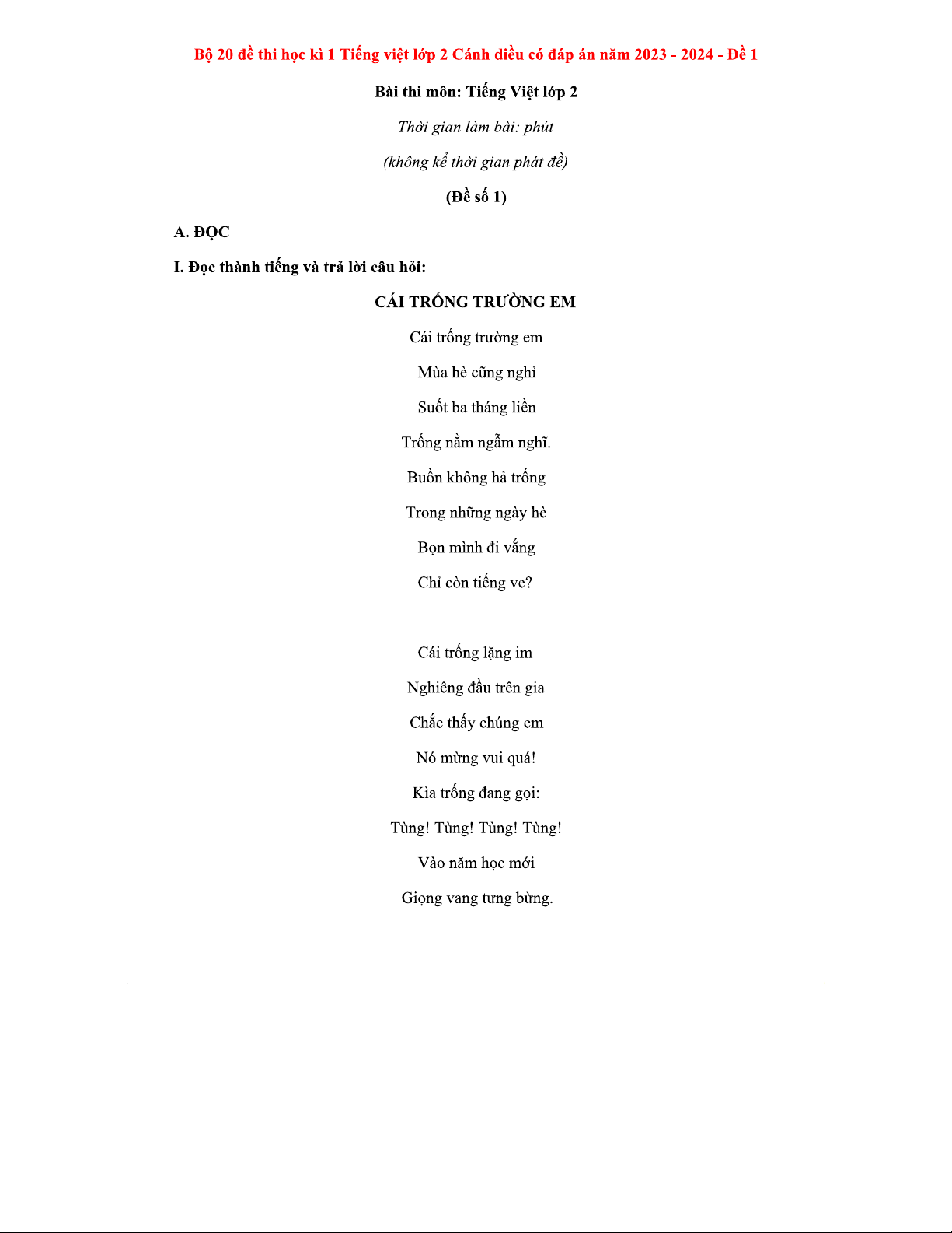 Đề thi Học kì 1 Tiếng Việt lớp 2 - Cánh Diều năm học 2023-2024