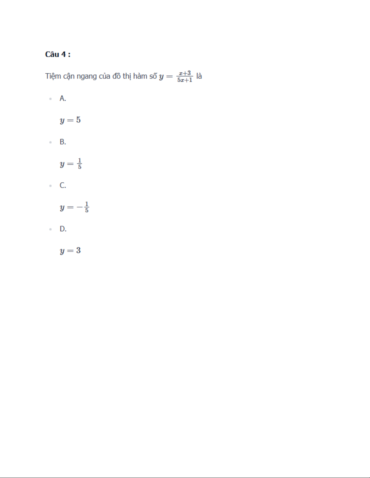 Tiệm cận ngang của đồ thị hàm số là • A. • B. • C. • D. Câu 5 :