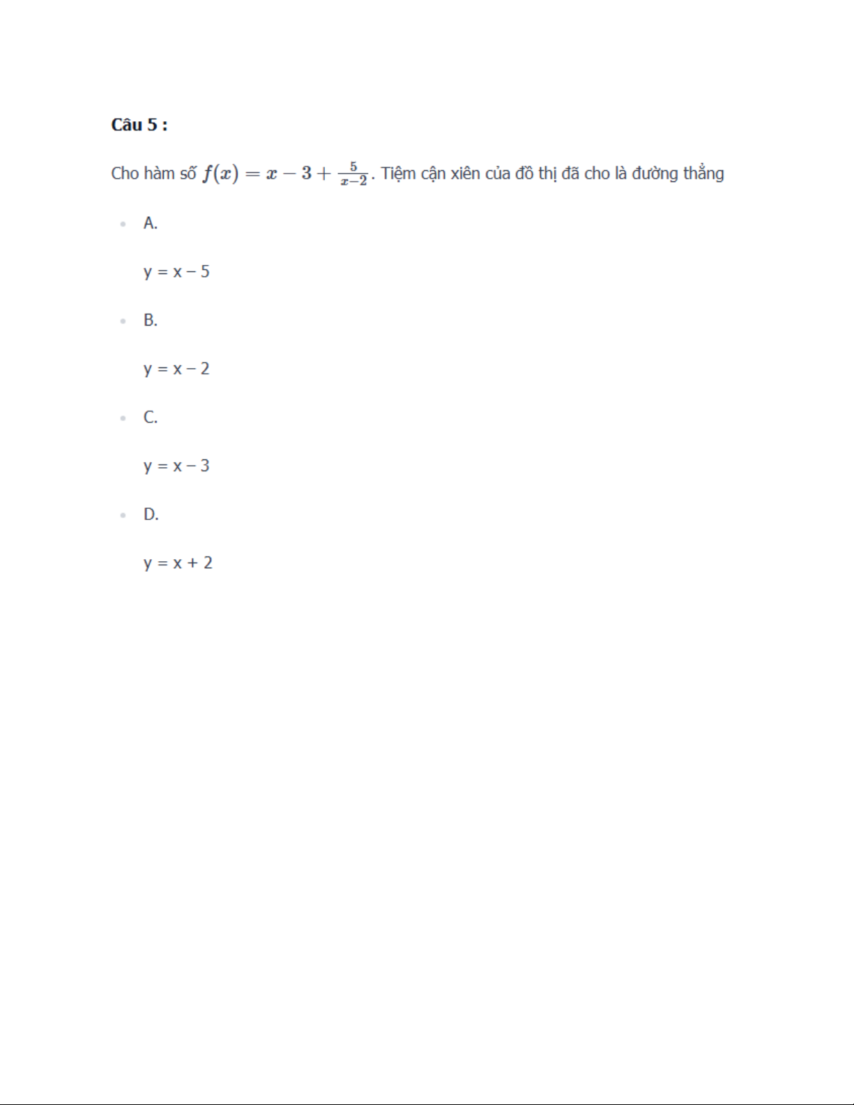 Cho hàm số . Tiệm cận xiên của đồ thị đã cho là đường thẳng • A. y = x – 5 • B. y = x – 2 • C. y = x – 3 • D. y = x + 2 Câu 6 :