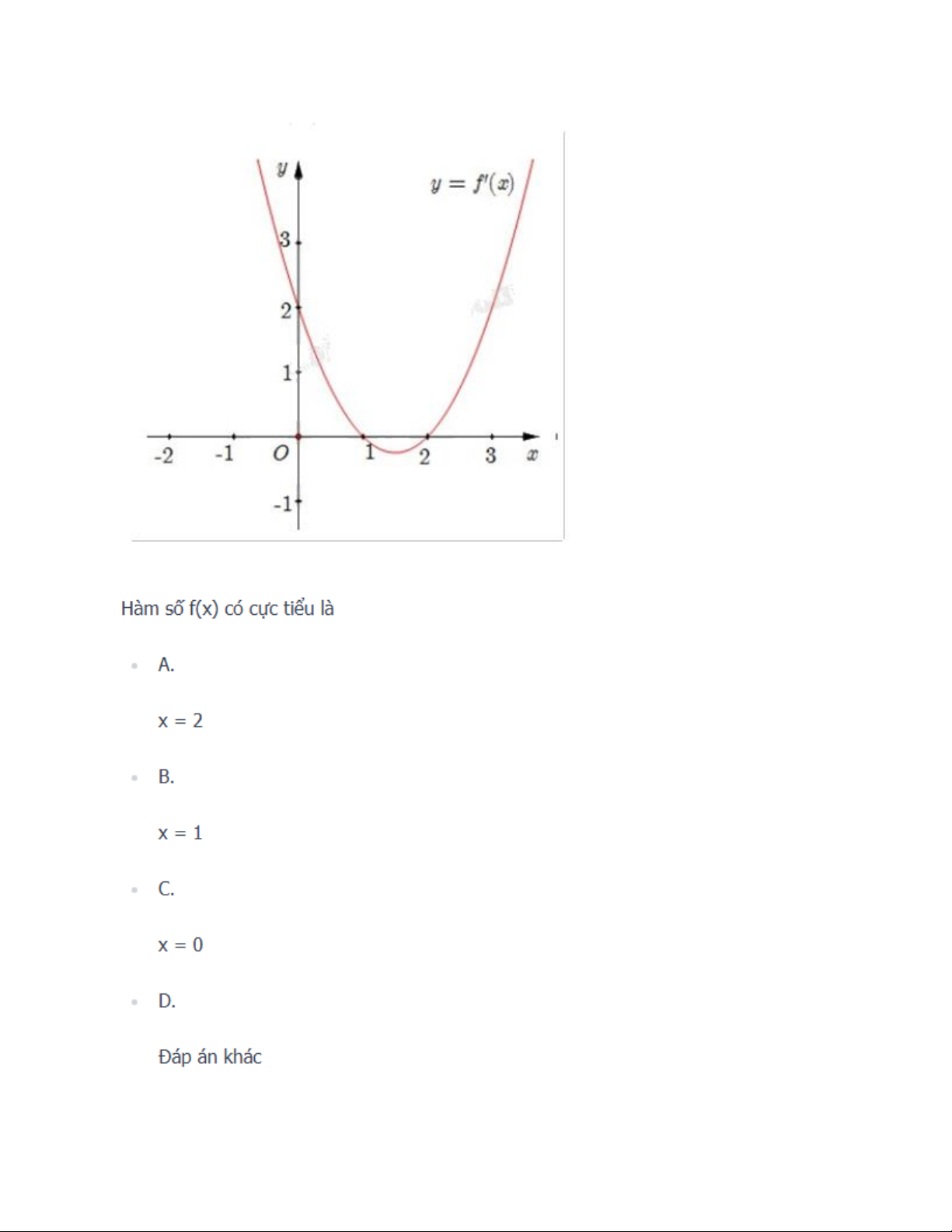 Hàm số f(x) có cực tiểu là • A. x = 2 • B. x = 1 • C. x = 0 • D. Đáp án khác Câu 7 :