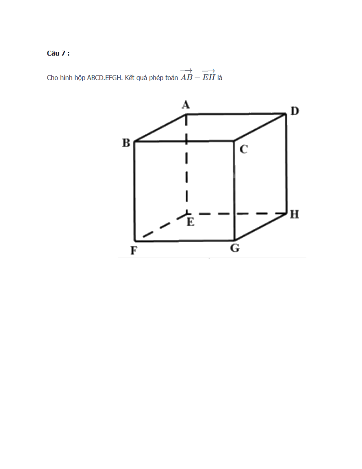 Cho hình hộp ABCD.EFGH. Kết quả phép toán là • A. • B. • C. • D. Câu 8 :