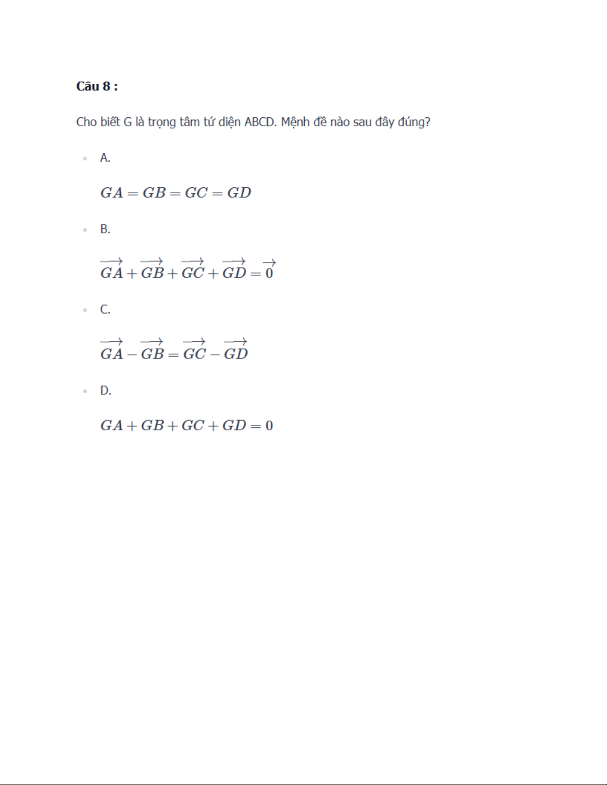 Cho biết G là trọng tâm tứ diện ABCD. Mệnh đề nào sau đây đúng? • A. • B. • C. • D. Câu 9 :