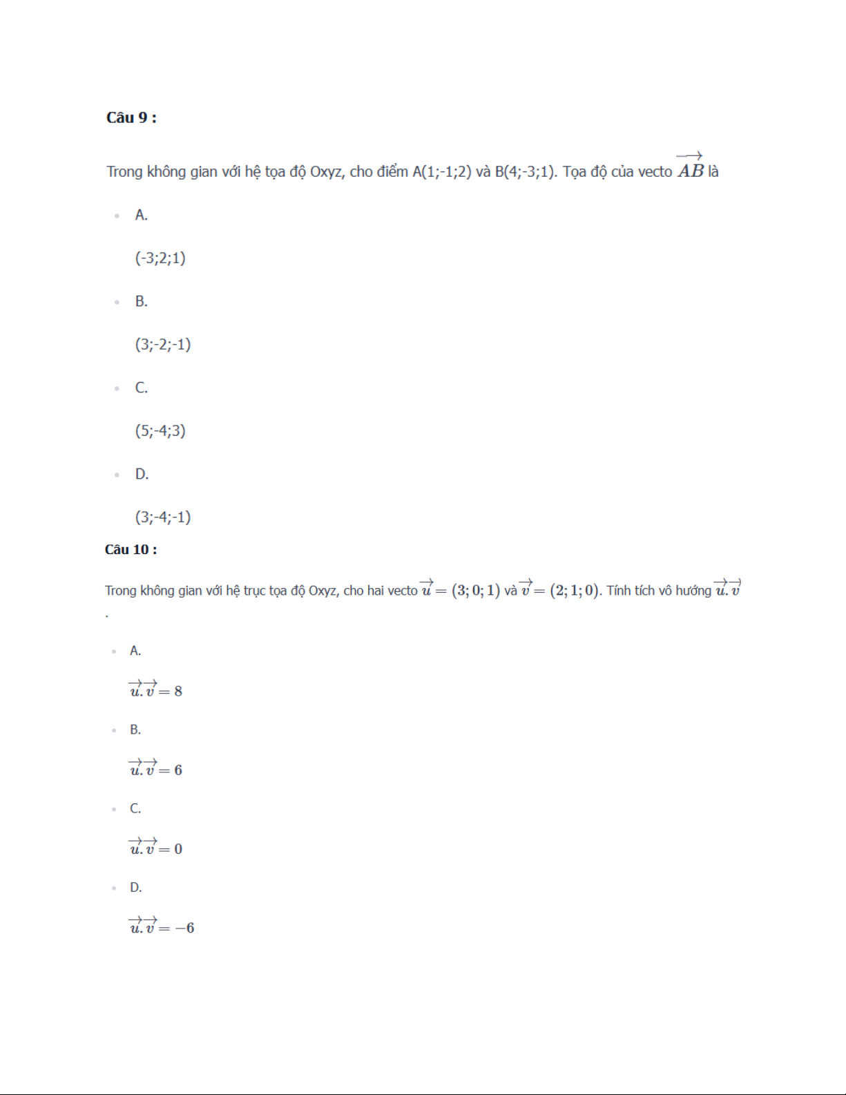 Trong không gian với hệ tọa độ Oxyz, cho điểm A(1;-1;2) và B(4;-3;1). Tọa độ của vecto là • A. (-3;2;1) • B. (3;-2;-1) • C. (5;-4;3) • D. (3;-4;-1) Câu 10 :