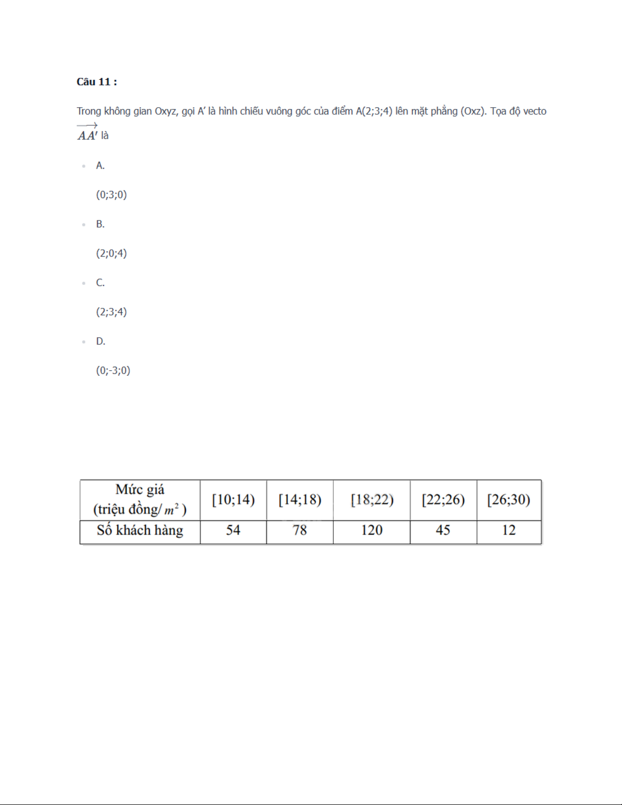 phẳng (Oxz). Tọa độ vecto là • A. (0;3;0) • B. (2;0;4) • C. (2;3;4) • D. (0;-3;0) Câu 12 :