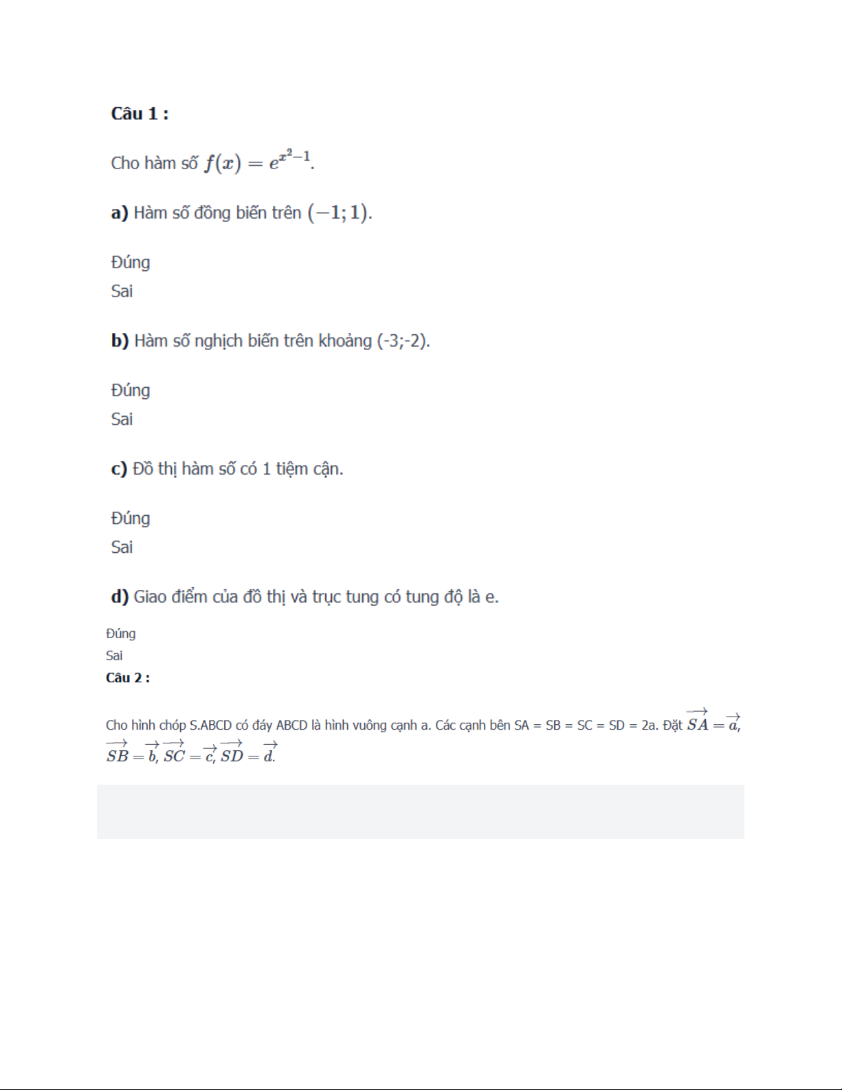 Thí sinh trả lời từ câu 1 đến câu 4. Trong mỗi ý a), b), c), d) ở mỗi câu, thí sinh chọn đúng hoặc sai. Câu 1 : Cho hàm số .