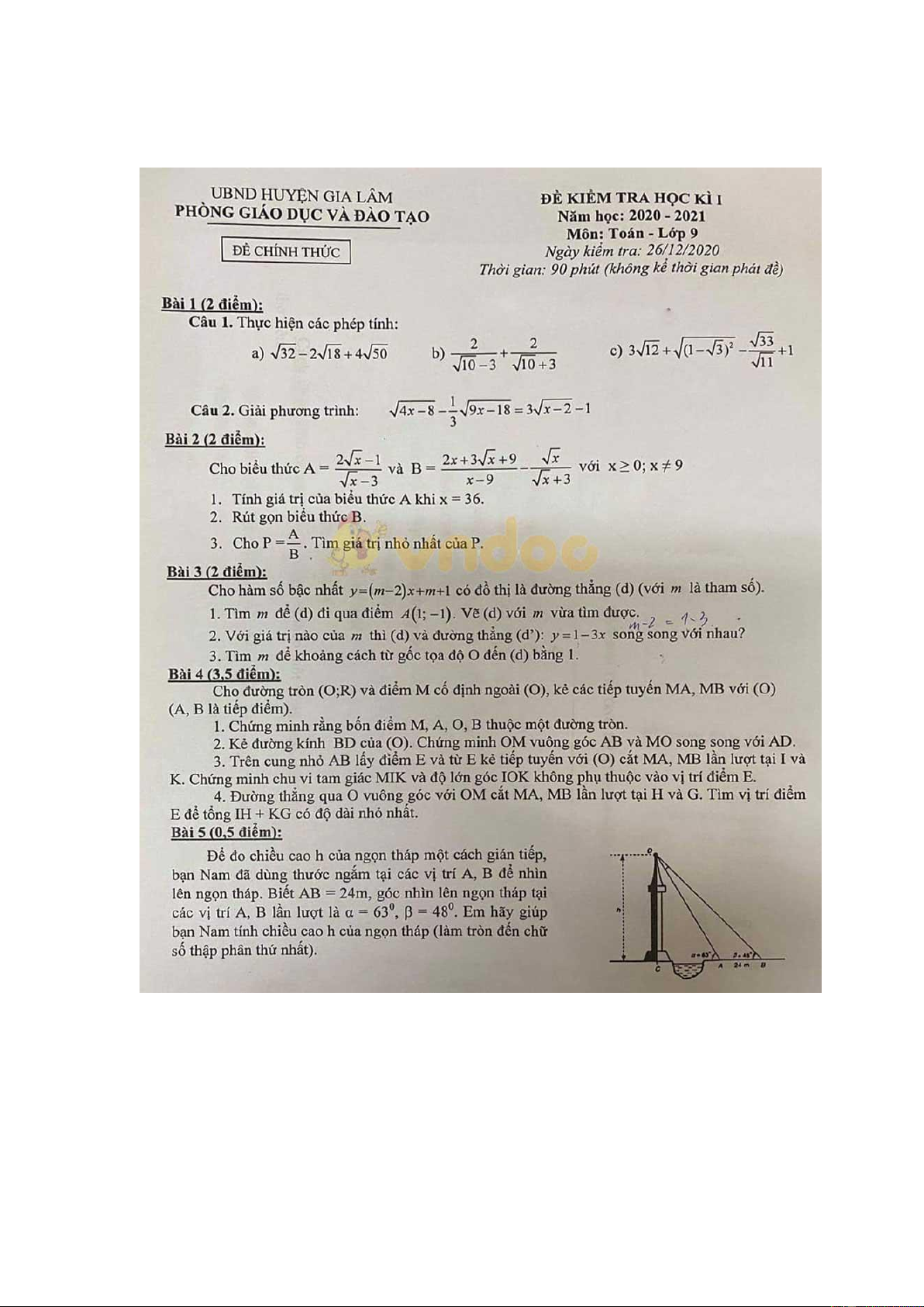Đề thi học kì 1 Toán 9 Phòng GD&ĐT huyện Gia Lâm, Hà Nội năm 2020 - 2021