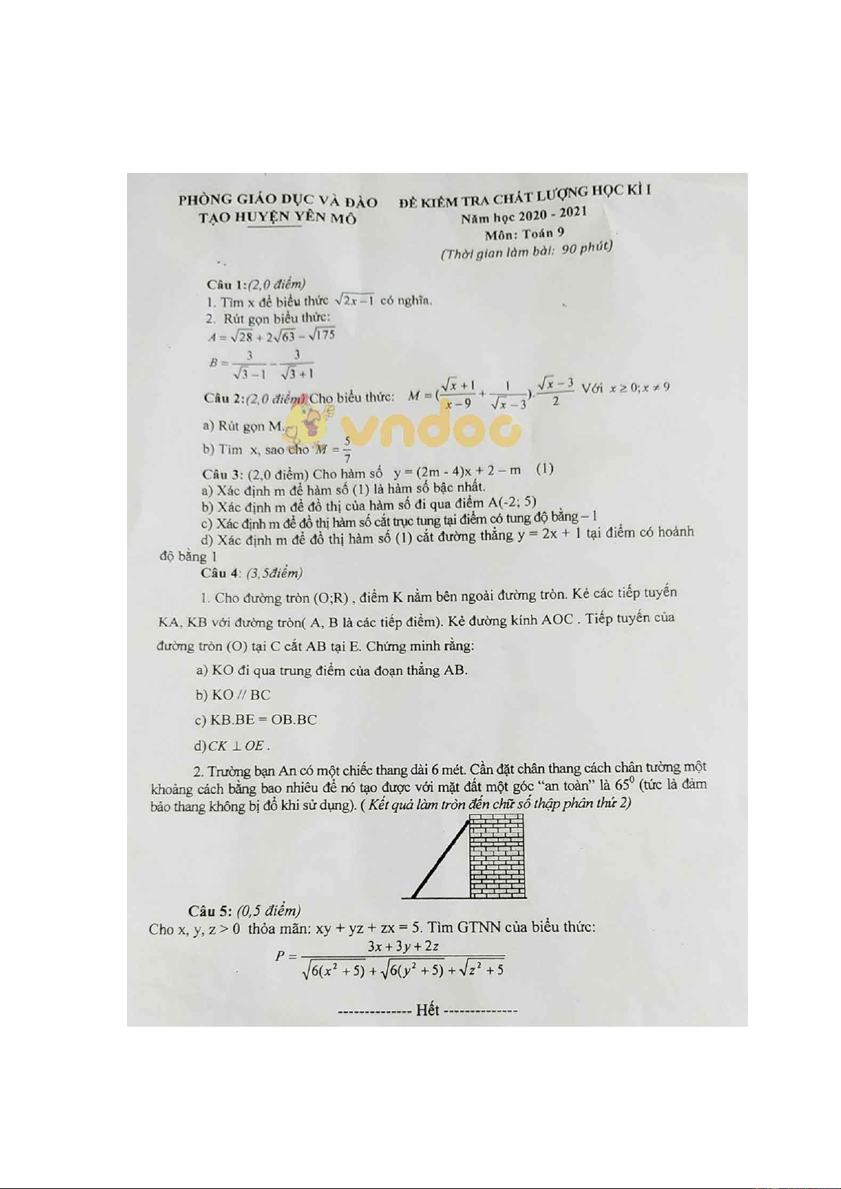 Đề thi học kì 1 Toán 9 Phòng GD&ĐT huyện Yên Mô, Ninh Bình năm 2020 - 2021 được VnDoc sưu tầm và đăng tải. Đây là đề thi tham khảo học kì 1 lớp 9 môn Toán dành cho các bạn học sinh ôn tập, củng cố kiến thức, rèn luyện kĩ năng làm bài Toán. Mời các bạn cùng tham khảo