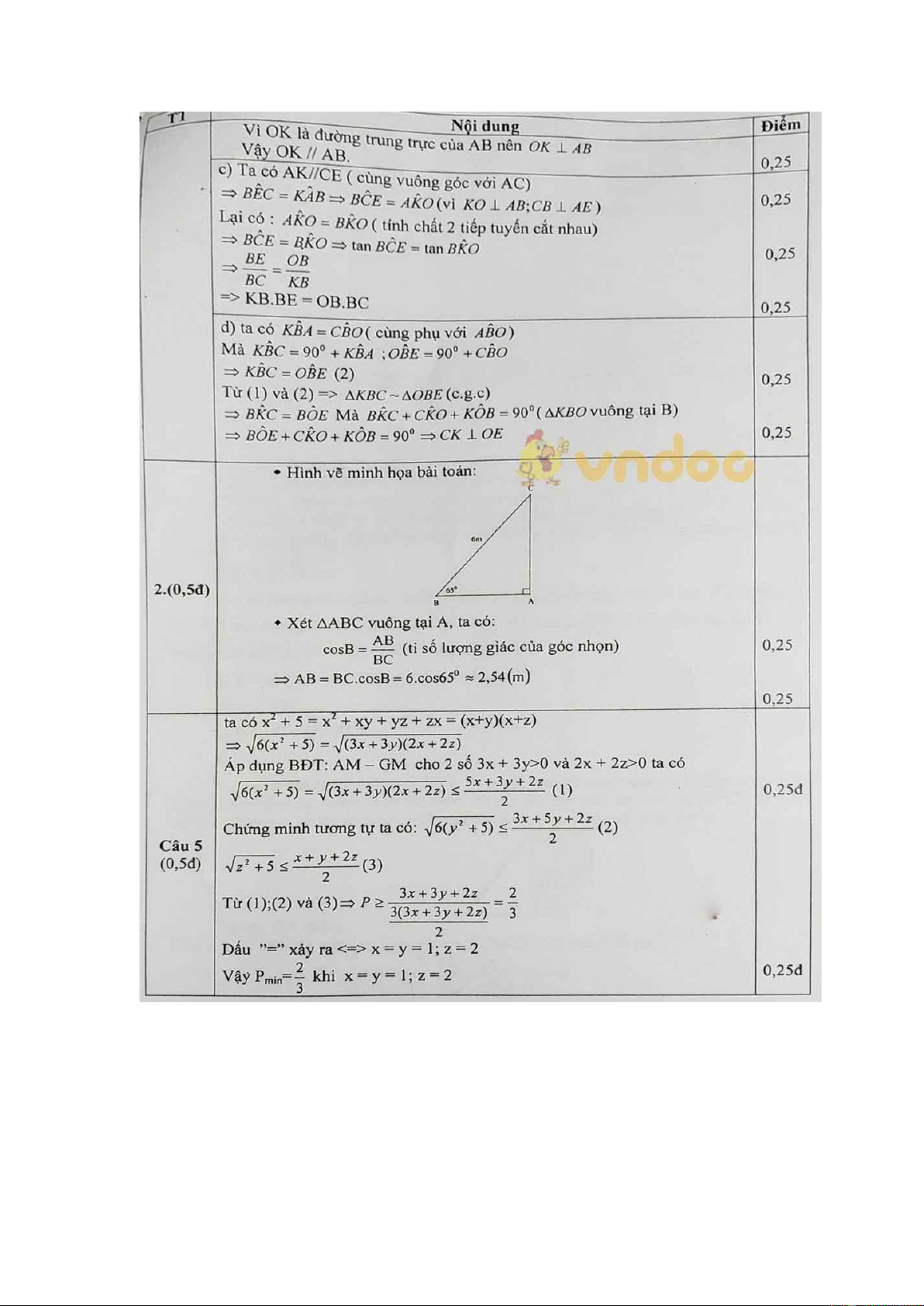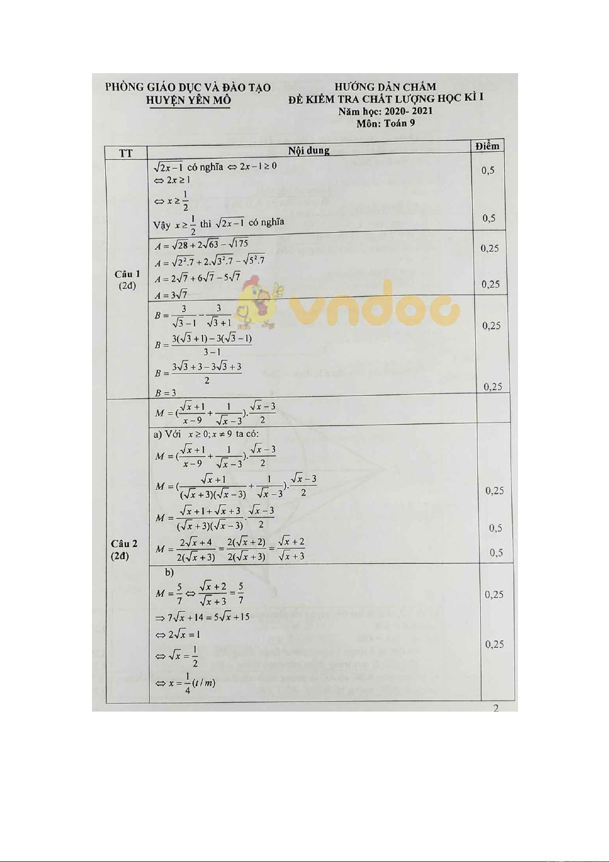 Đáp án đề thi học kì 1 Toán 9 Phòng GD&ĐT huyện Yên Mô, Ninh Bình năm 2020 - 2021