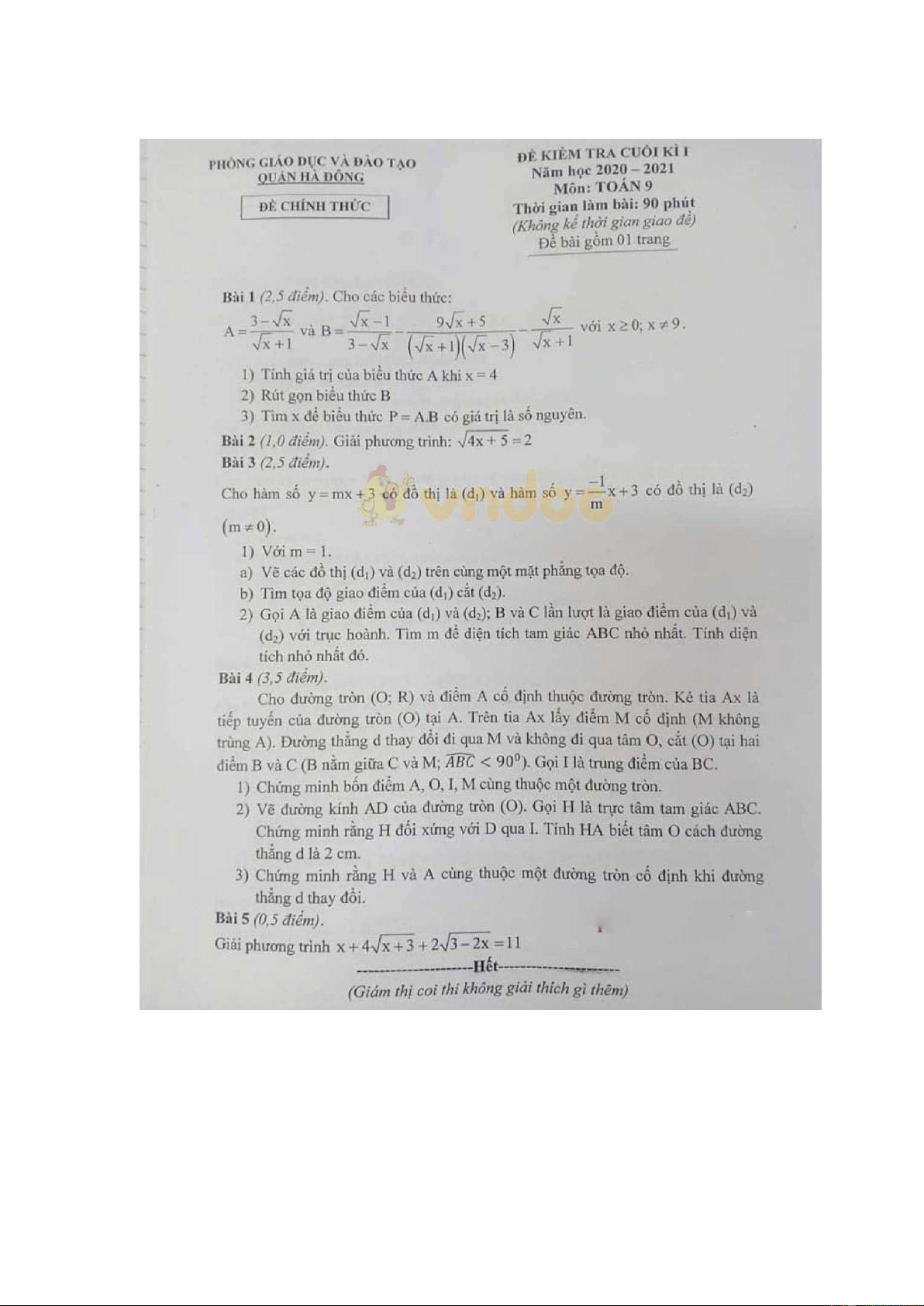 Đề thi học kì 1 Toán 9 Phòng GD&ĐT quận Hà Đông, Hà Nội năm 2020 - 2021