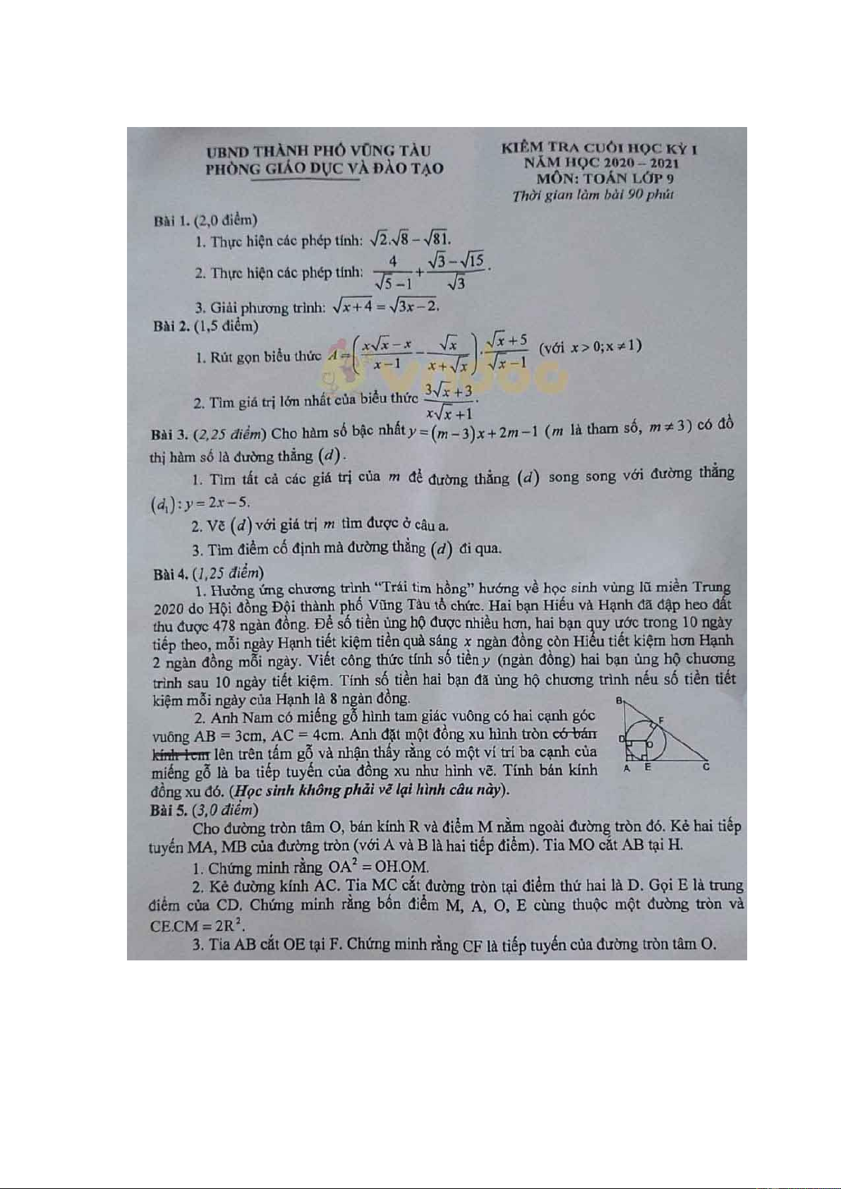 Đề thi học kì 1 Toán 9 Phòng GD&ĐT TP Vũng Tàu năm 2020 - 2021