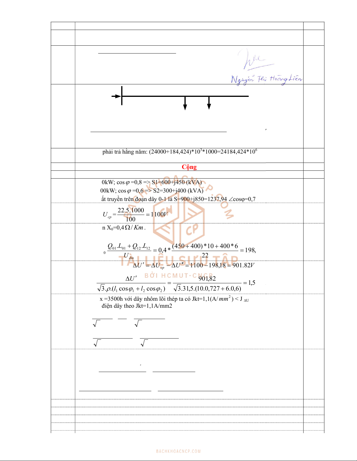 Tiền điện phải trả hằng năm: (24000+184,424)*103*1000=24184,424*106 đồng n 0,5 Cộng 2 Câu 2 ý 1 -Tải 1: 600kW; cos =0,8 , => = > S1=600+j450 (kVA) 0,25