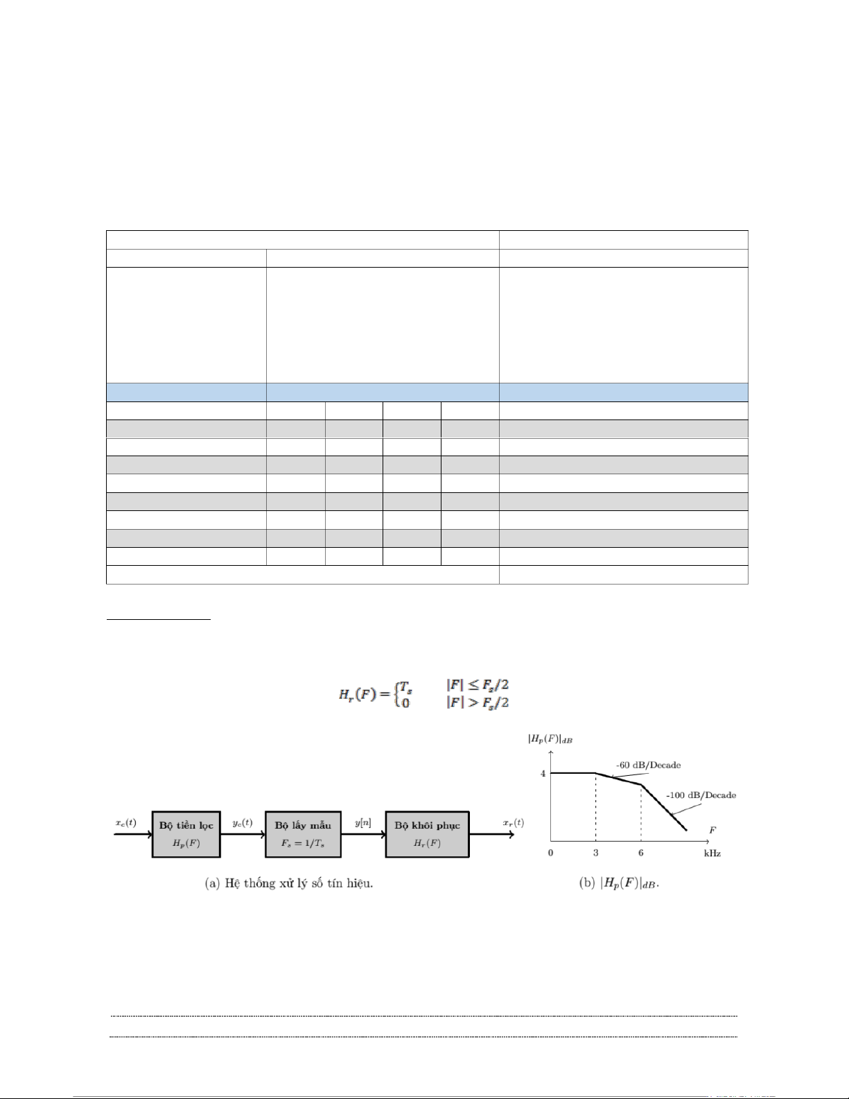 12cos(8πt)+ 3cos(14πt), với t có đơn vị là ms và tần số lấy mẫu Fs = 1/Ts. Bộ khôi phục có đáp ứng tần số Hr(F):