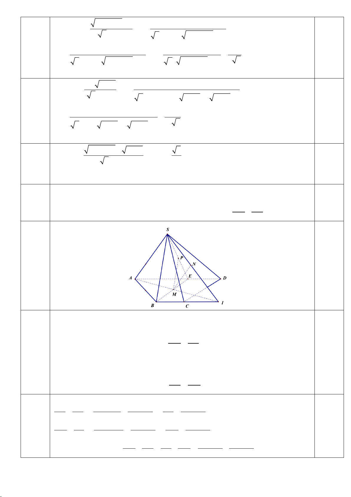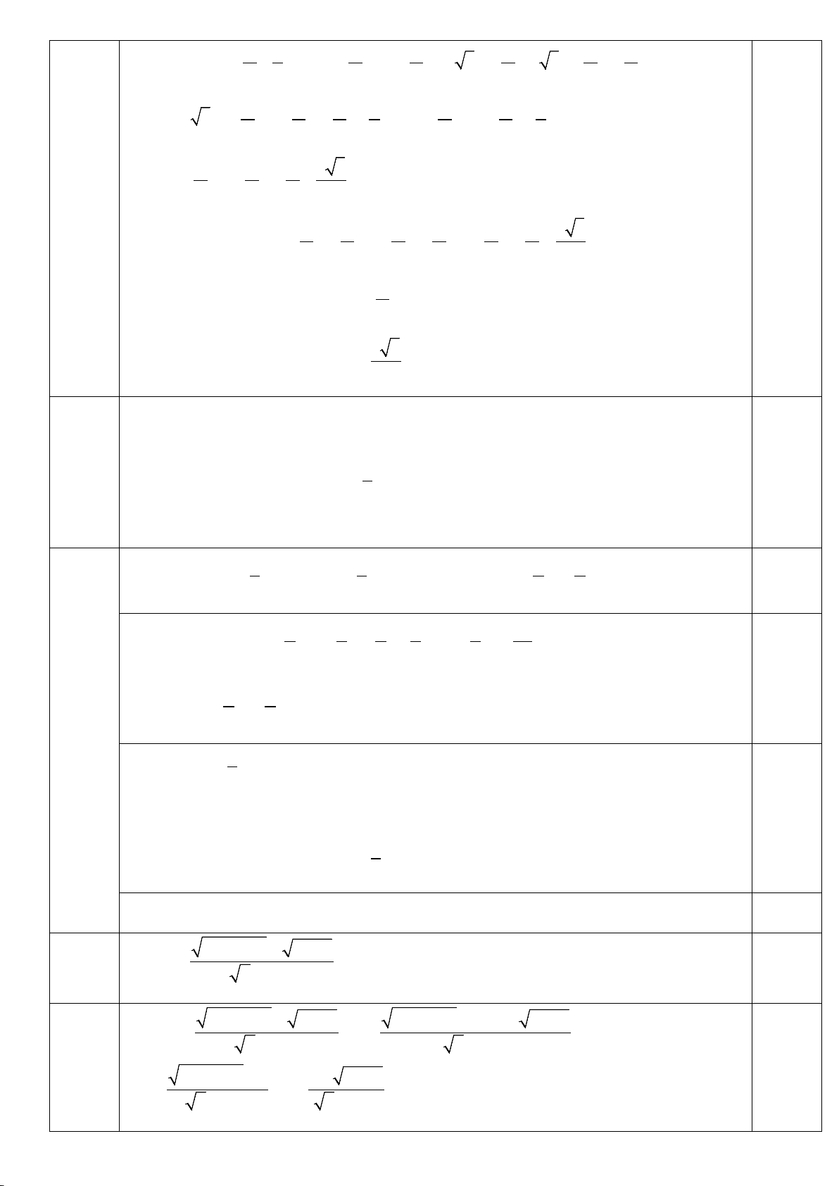 x + x + 2 − 7x +1 Câu 3 Tính lim 1,5 x 1 → 2 (x − ) 1 điểm 2 3 2 3 + + − + + + − + − + Ta có x x 2 7x 1 x x 2 2 2 7x 1 lim = lim x 1 → 2 (x − ) x 1 1 → 2 (x − ) 1 0,25 2 3 x + x + 2 − 2 2 − 7x +1 = lim + lim = I + J . x 1 → 2 (x − ) x 1 1 → 2 (x − ) 1 2 2 + + − + + − Tính x x 2 2 x x 2 4 I = lim = lim x 1 → 2 (x − ) x 1 1 → 2 (x − )