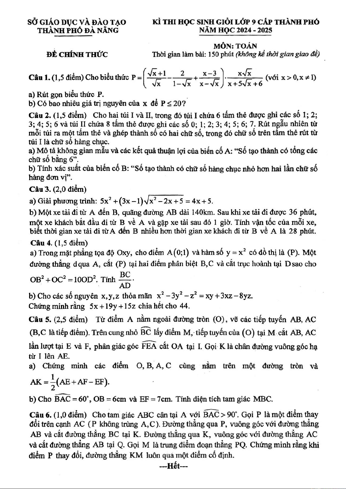 Đề thi học sinh giỏi Toán 9 năm 2024 – 2025 sở GD&ĐT Đà Nẵng