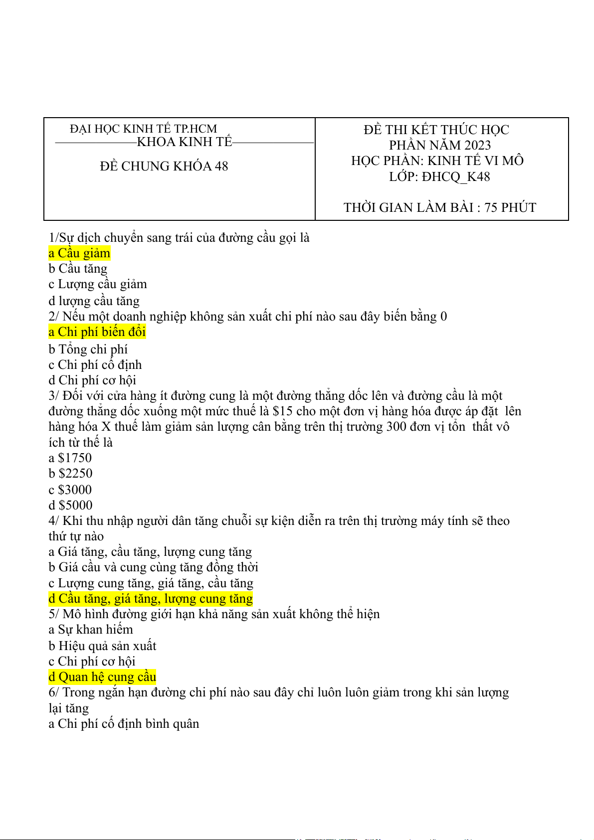 ĐẠI HỌC KINH TẾ TP.HCM ĐỀ THI KẾT THÚC HỌC ⸻⸻⸻ KHOA ⸻⸻⸻ KINH TẾ⸻⸻⸻⸻⸻⸻ PHẦN NĂM 2023 ĐỀ CHUNG KHÓA 48