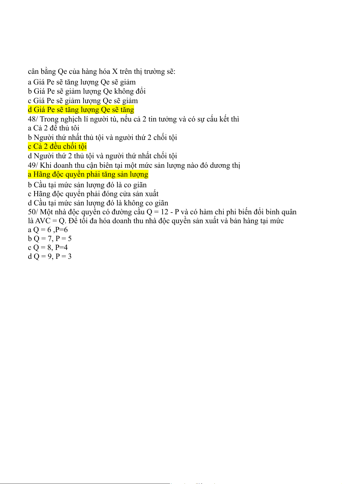 50/ Một nhà độc quyền có đường cầu Q = 12 - P và có hàm chi phi biến đổi binh quân