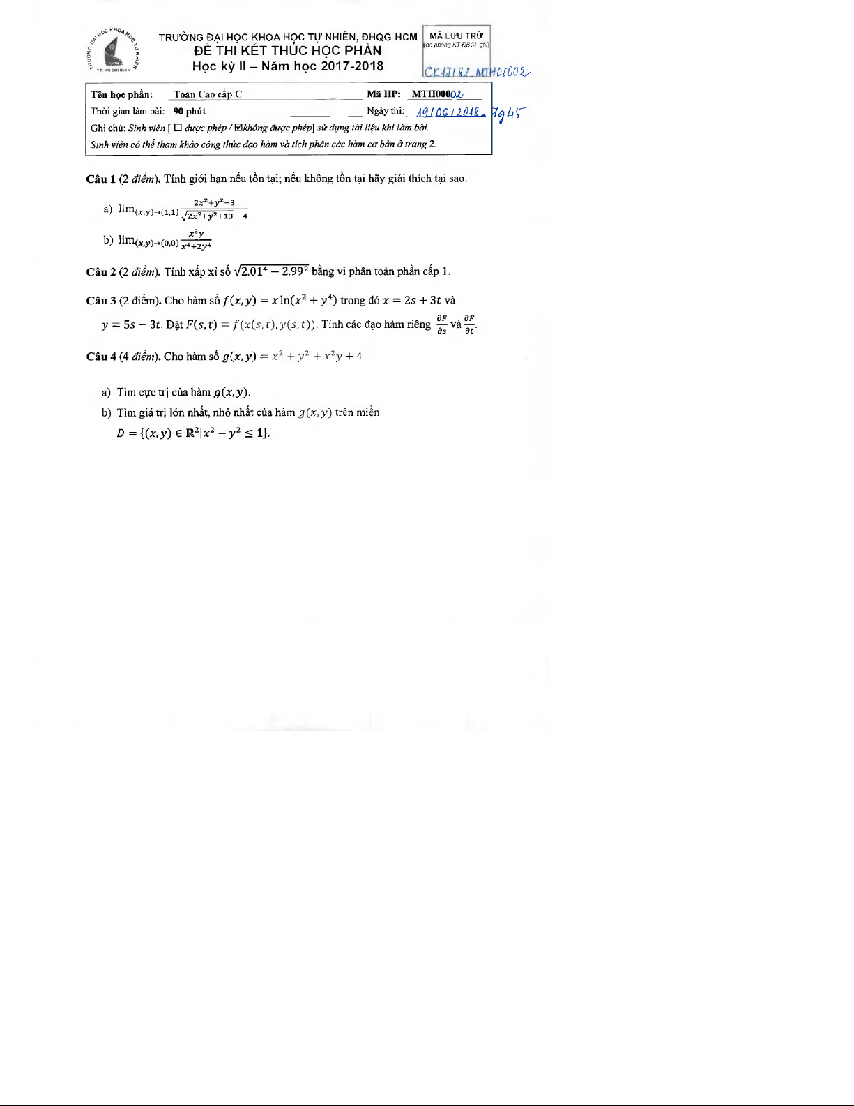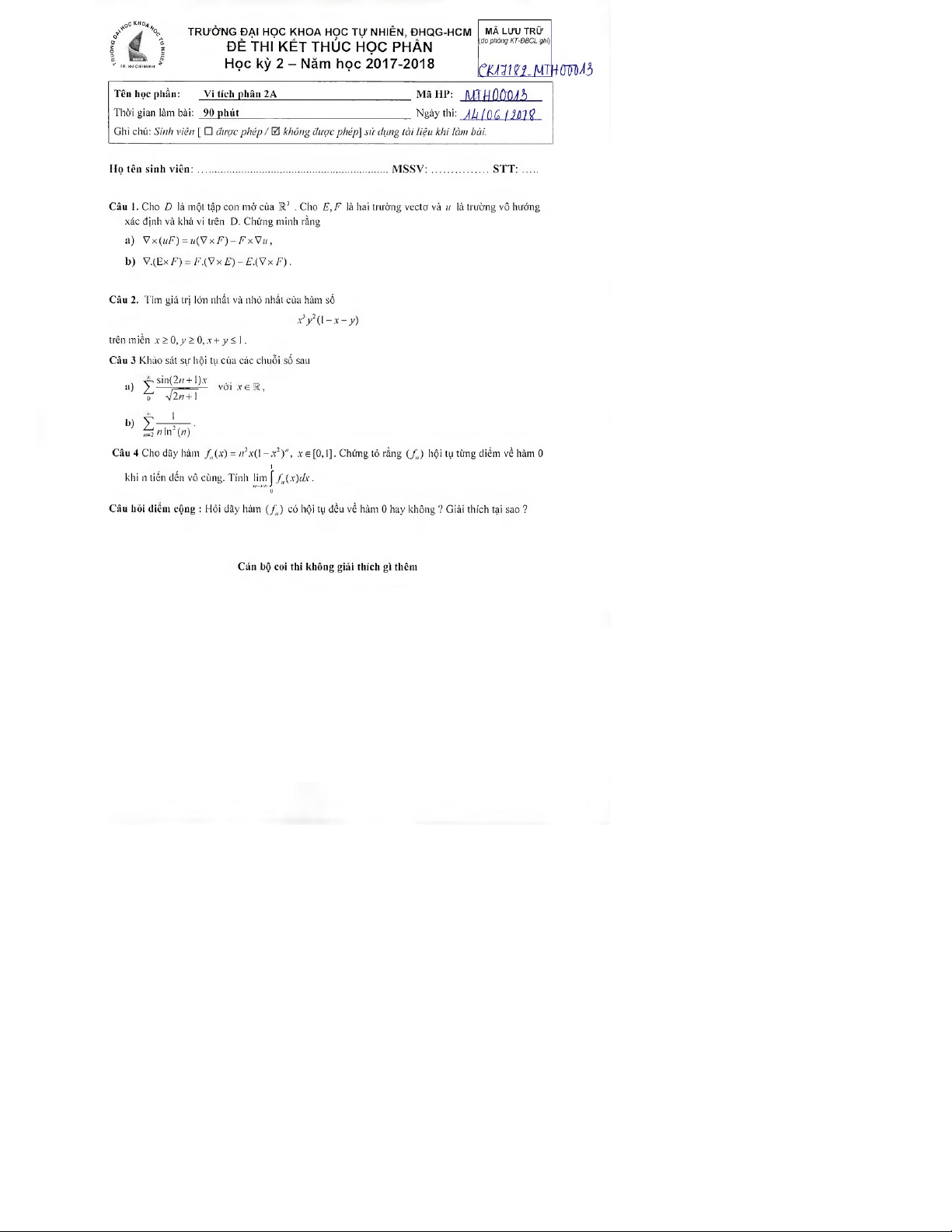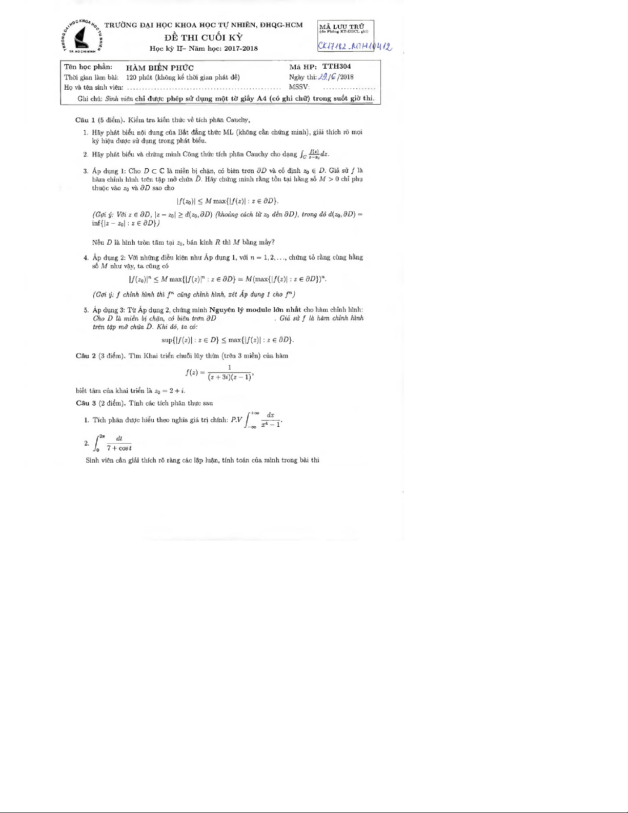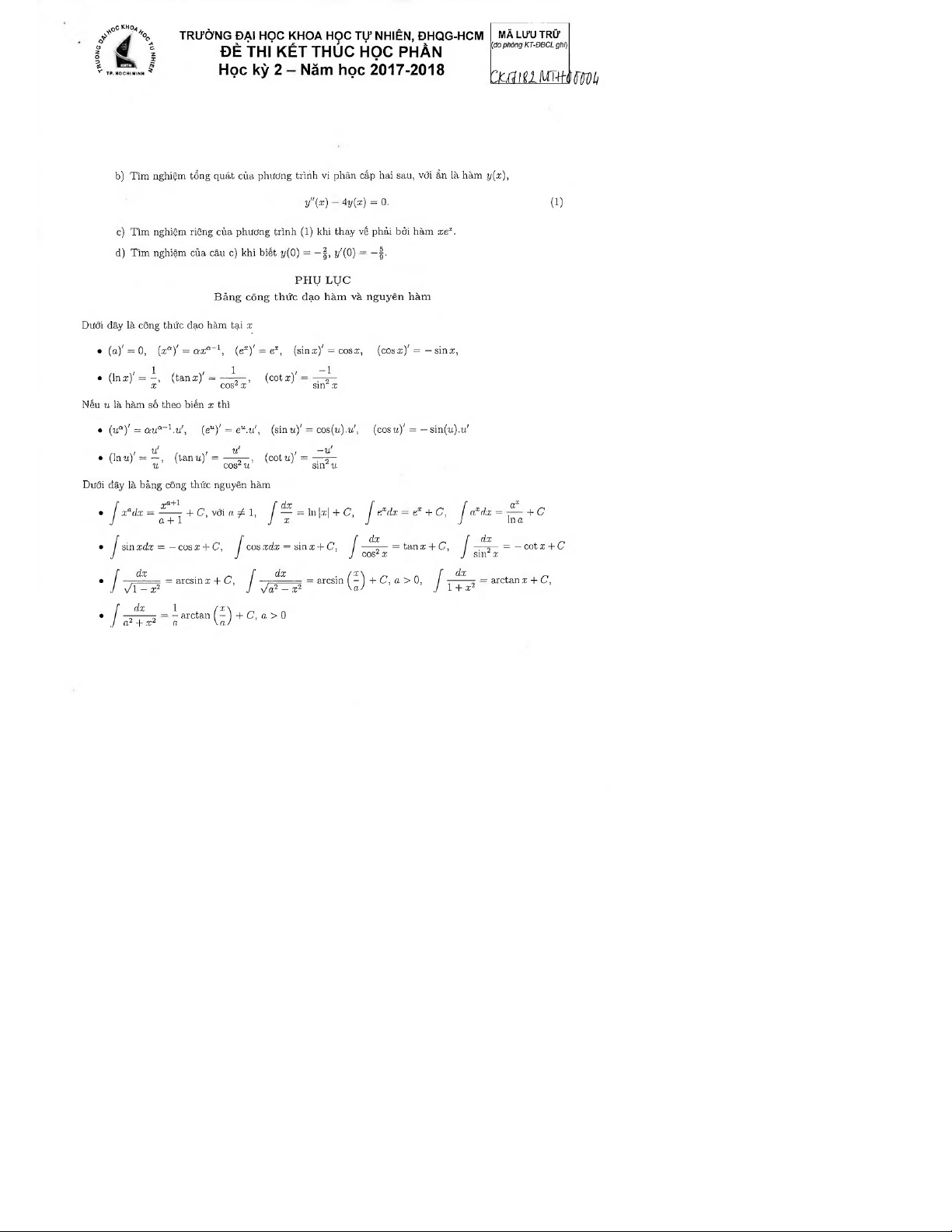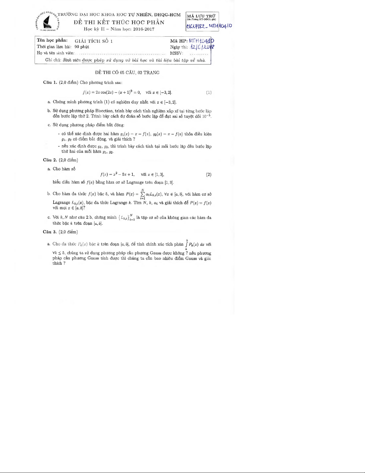 TRƯỜNG ĐẠI HỌC KHOA HỌC TỰ NHIÊN, ĐHQG-HCM MÃ LƯU TRỮ ĐỀ THI CUỐI KÌ (do Phòng KT-ĐBCL ghi)