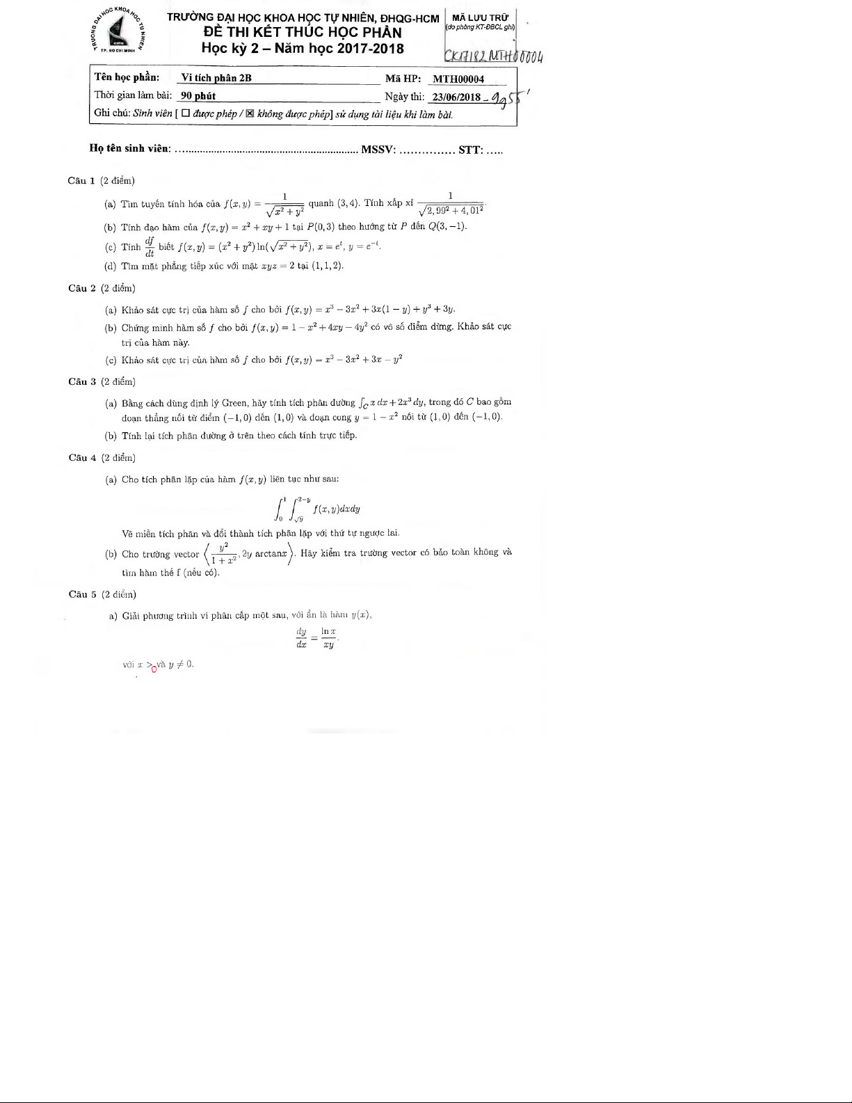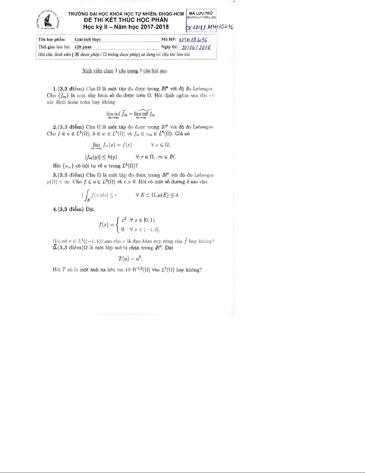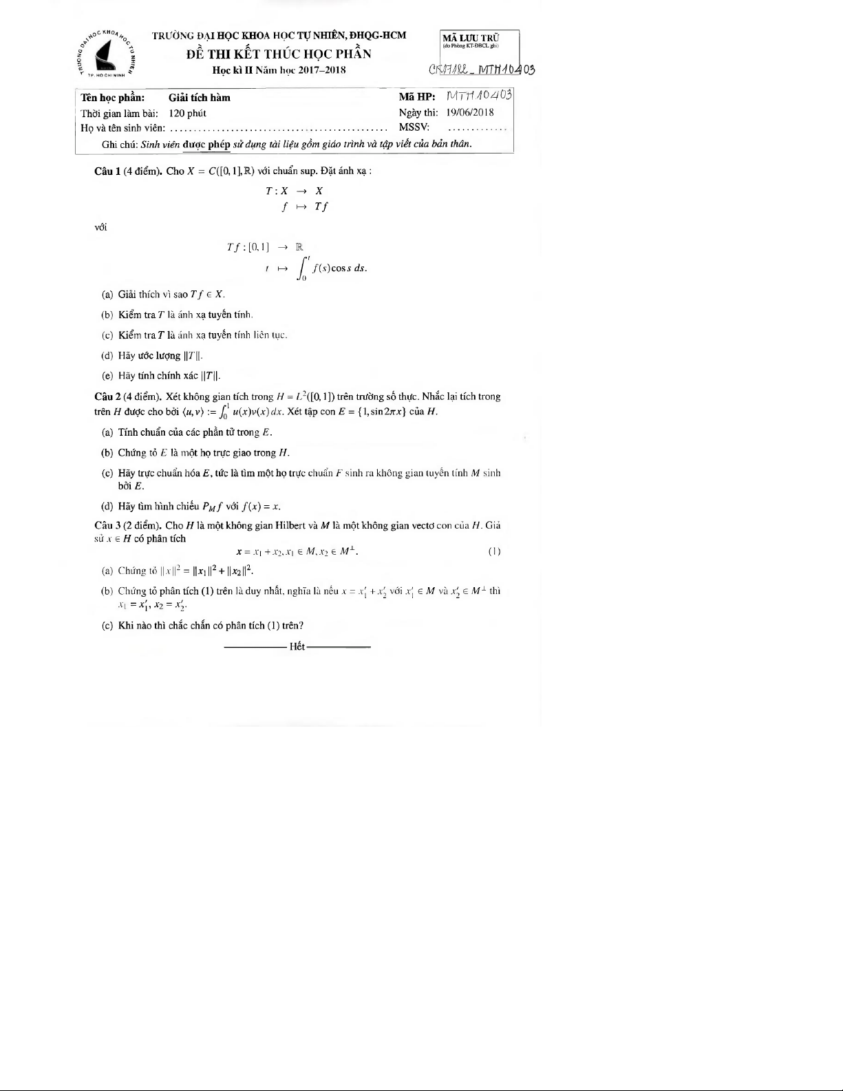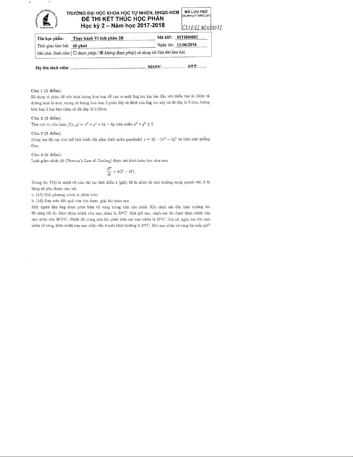 TRƯỜNG ĐẠI HỌC KHOA HỌC TỰ NHIÊN, ĐHQG-HCM MÃ LƯU TRỮ ĐỀ THI CUỐI KÌ (do Phòng KT-ĐBCL ghi)