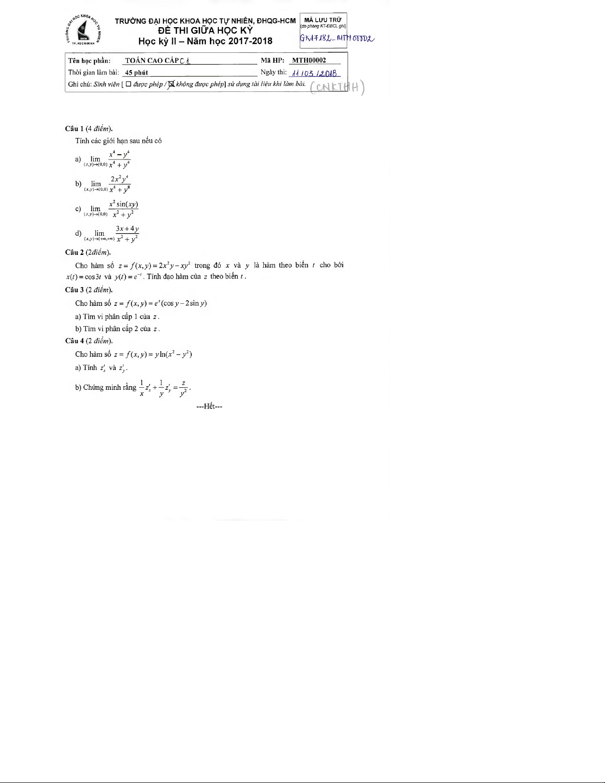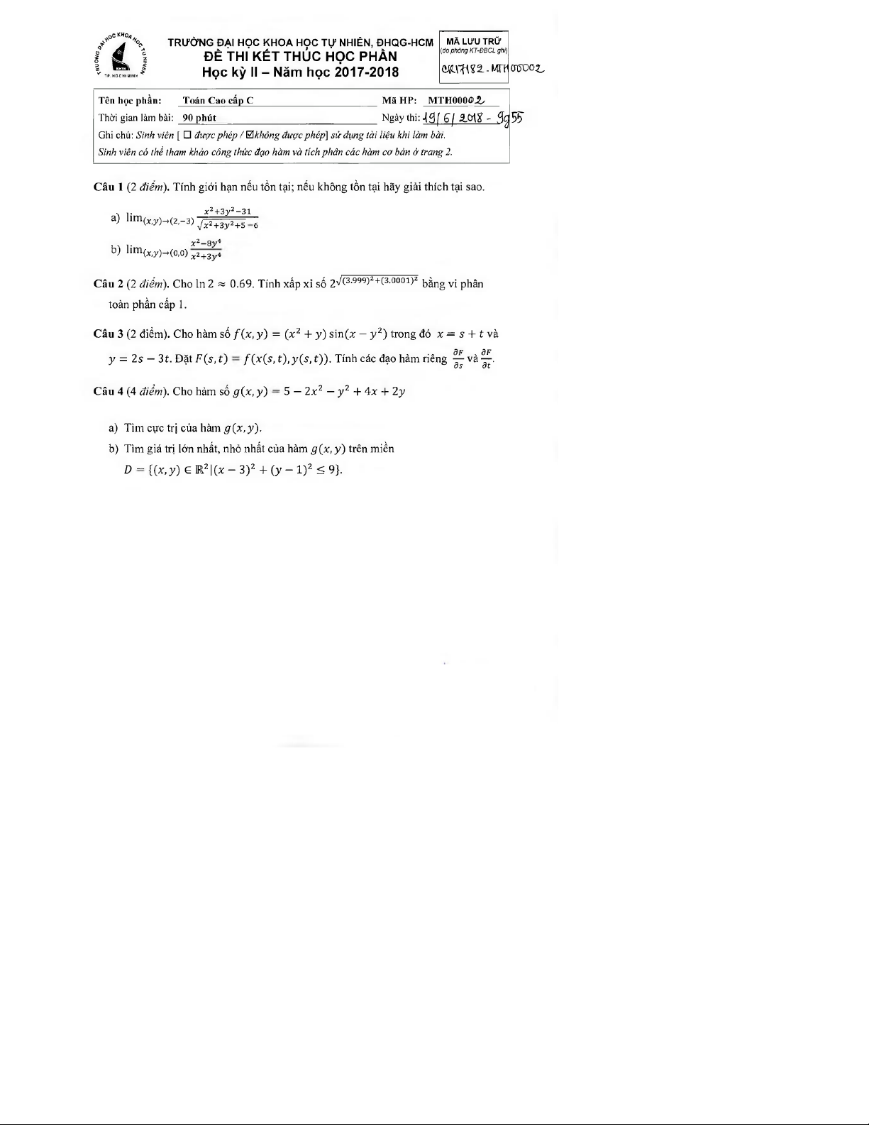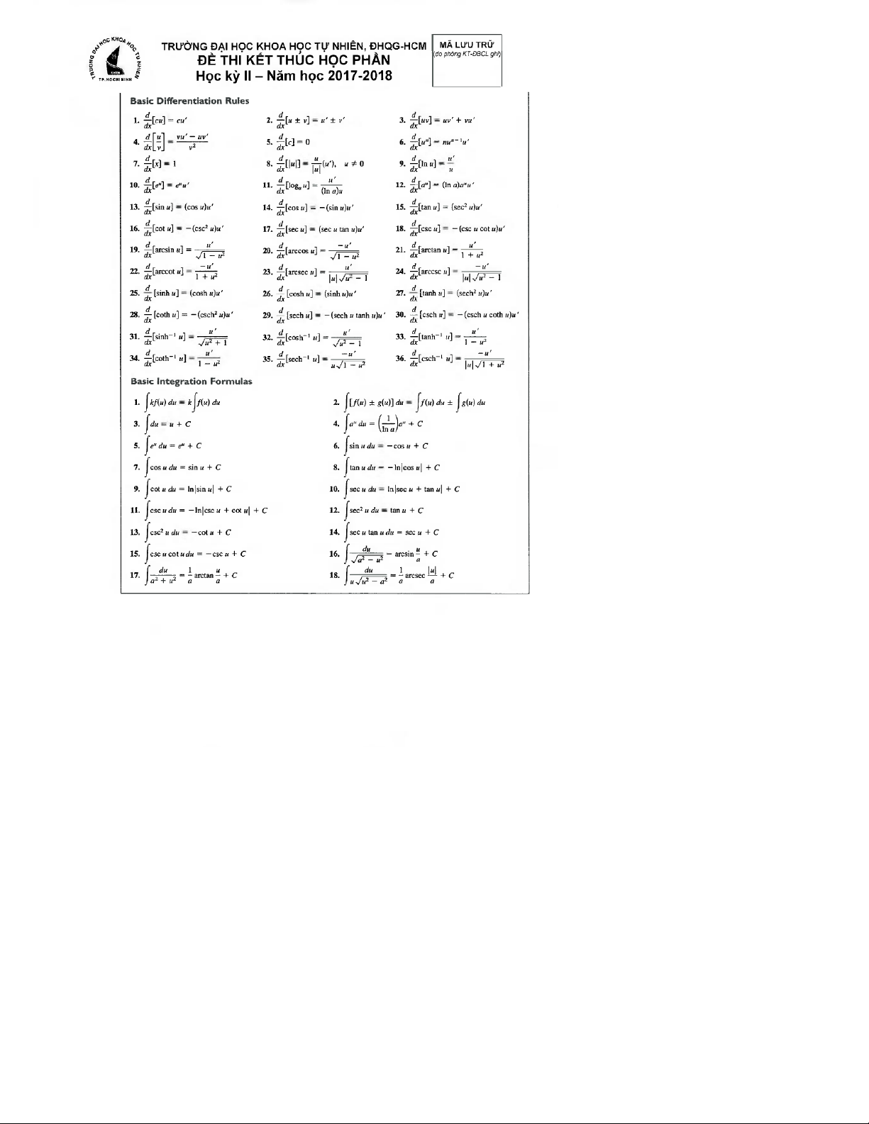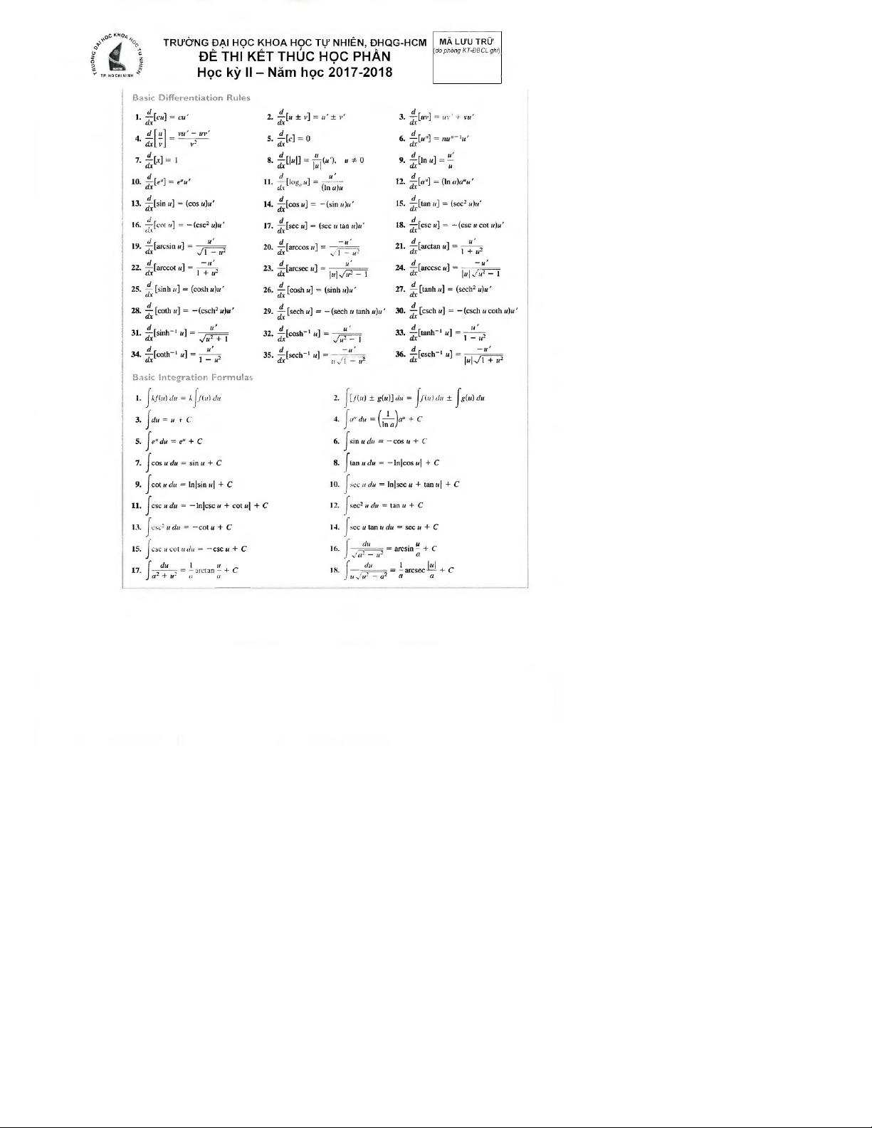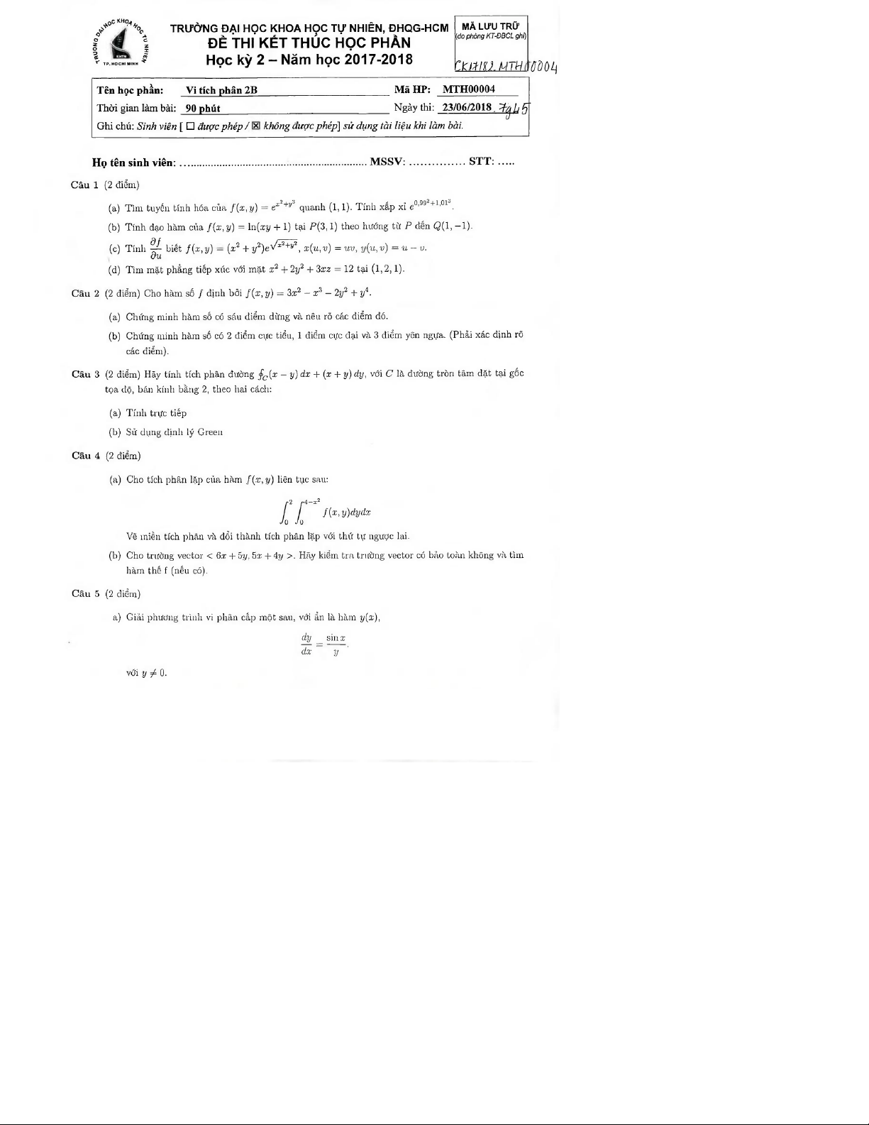 TRƯỜNG ĐẠI HỌC KHOA HỌC TỰ NHIÊN, ĐHQG-HCM MÃ LƯU TRỮ ĐỀ THI CUỐI KÌ (do Phòng KT-ĐBCL ghi)