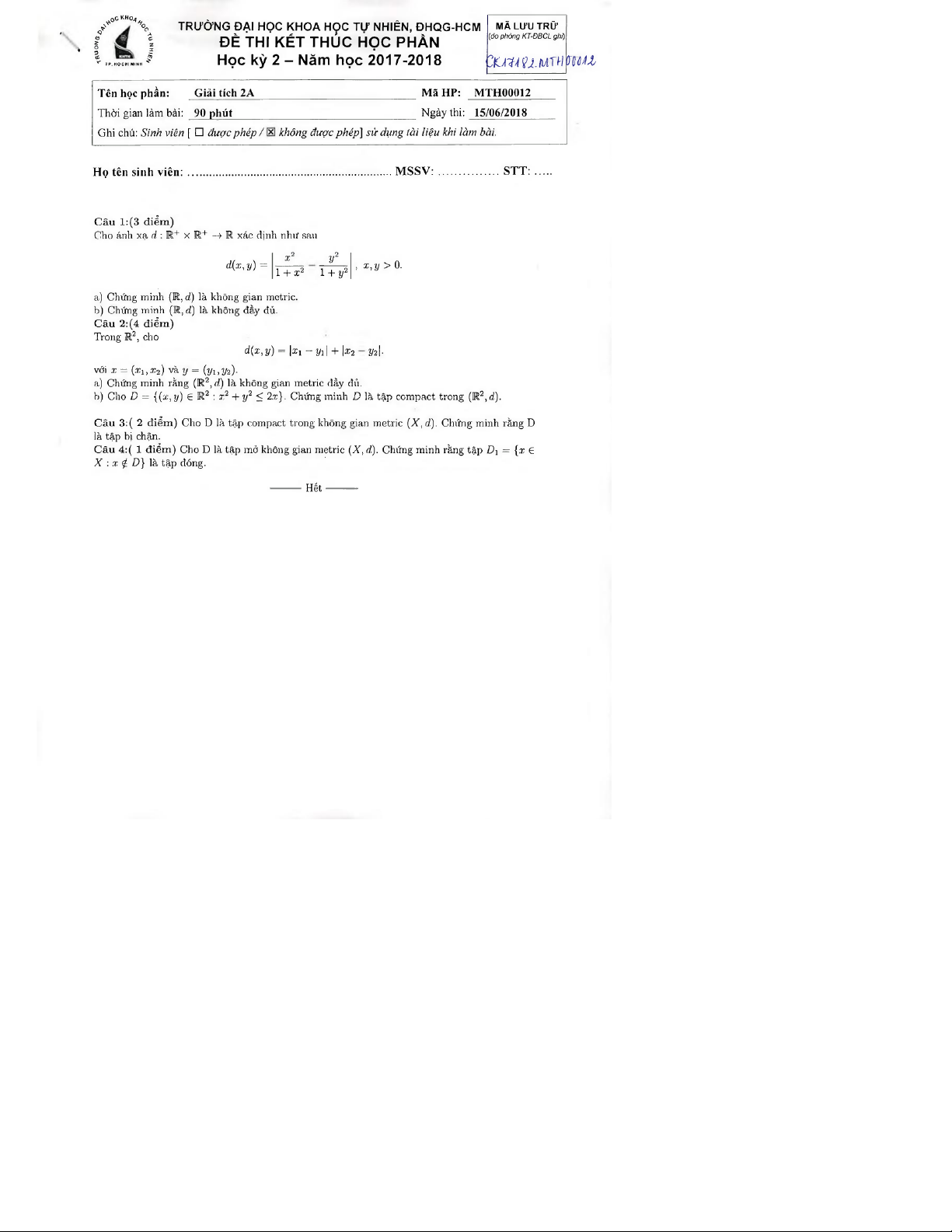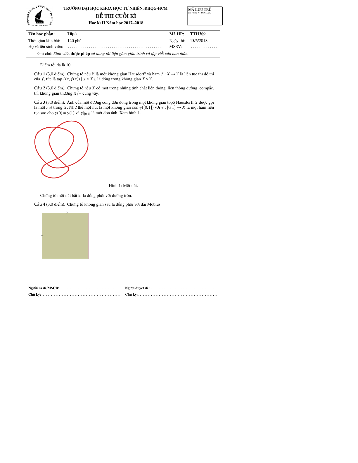Học kì II Năm học 2017–2018 Tên học phần: Tôpô Mã HP: TTH309 Thời gian làm bài: 120 phút Ngày thi: 15/6/2018 Họ và tên sinh viên: