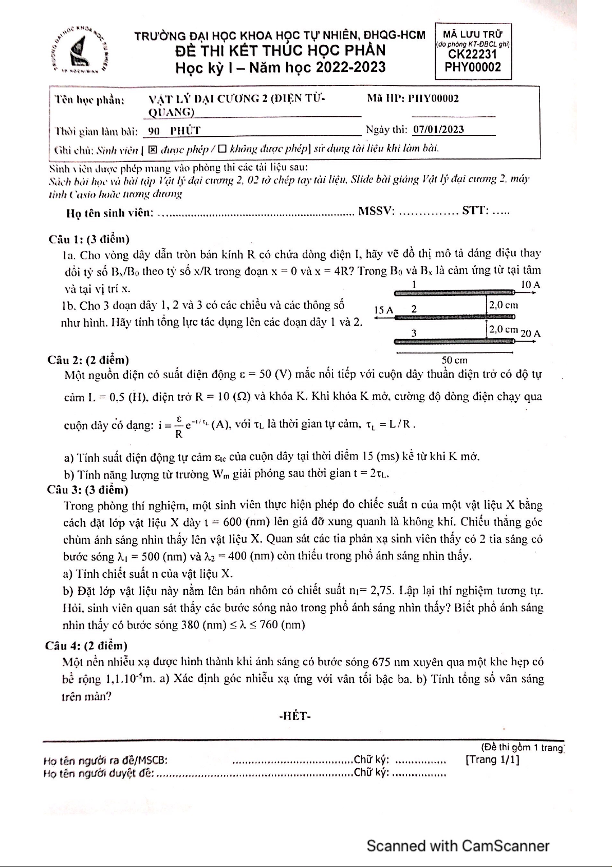 Đề thi kết thúc học phần học kỳ I năm học 2022-2023 môn Vật Lý đại cương 2 | Trường Đại học Khoa học tự nhiên, Đại học Quốc gia Thành phố Hồ Chí Minh