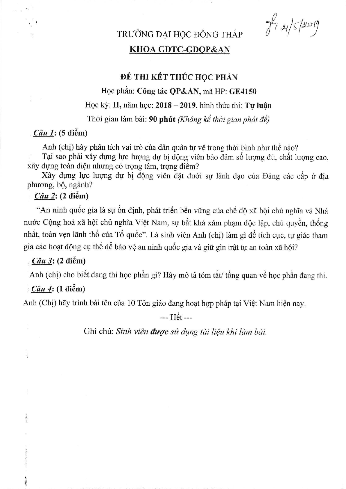 Đề thi kết thúc học phần môn Công tác quốc phòng an ninh | Đại học Đồng Tháp