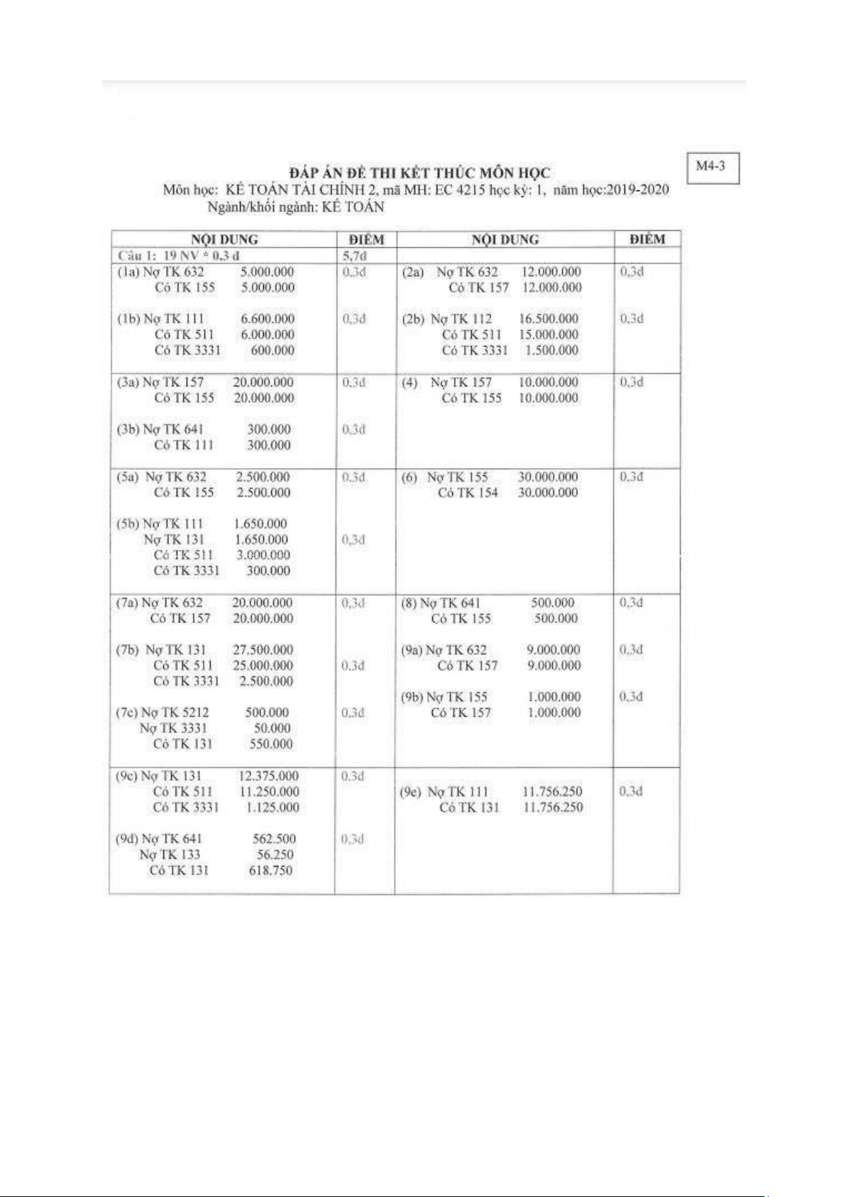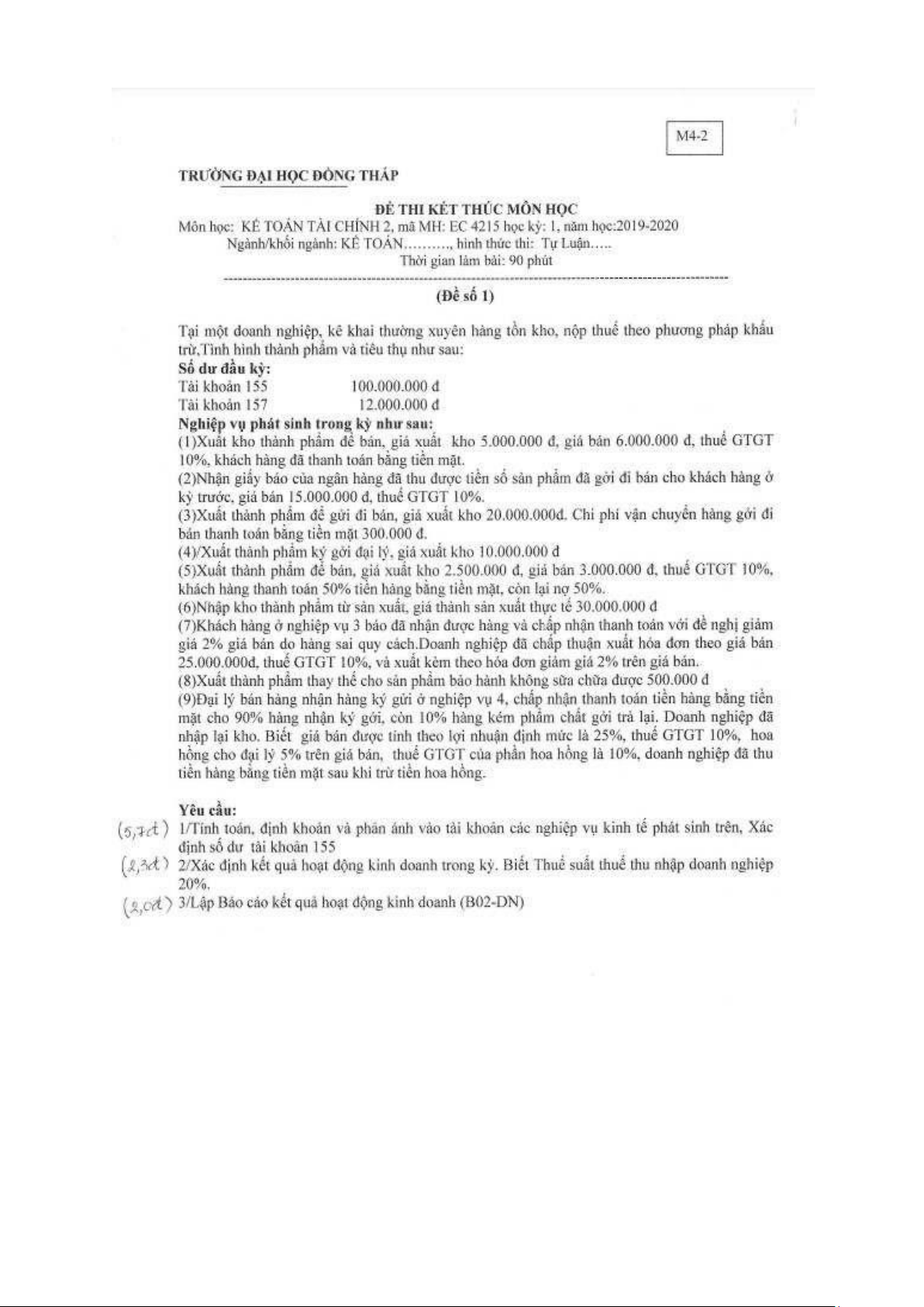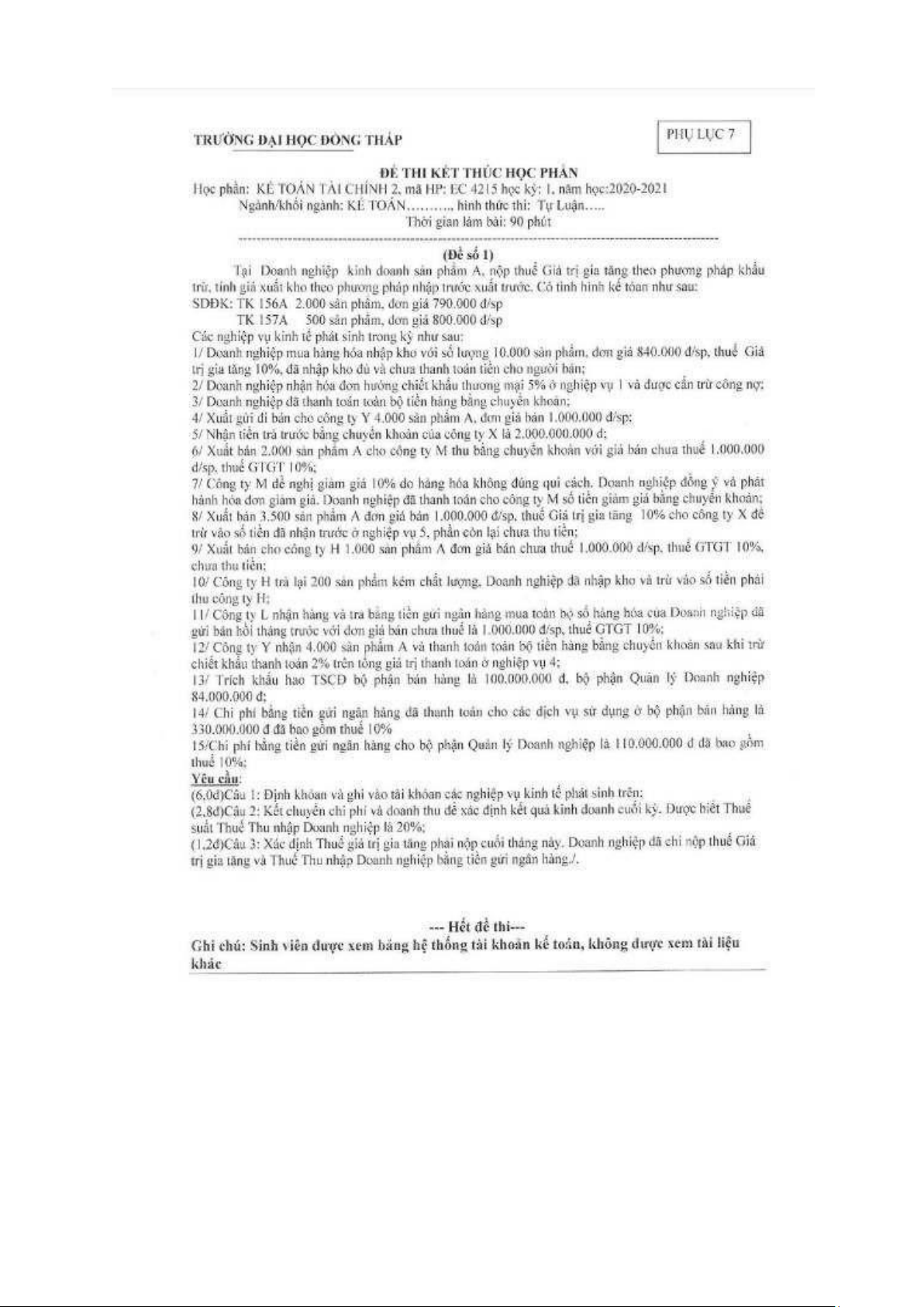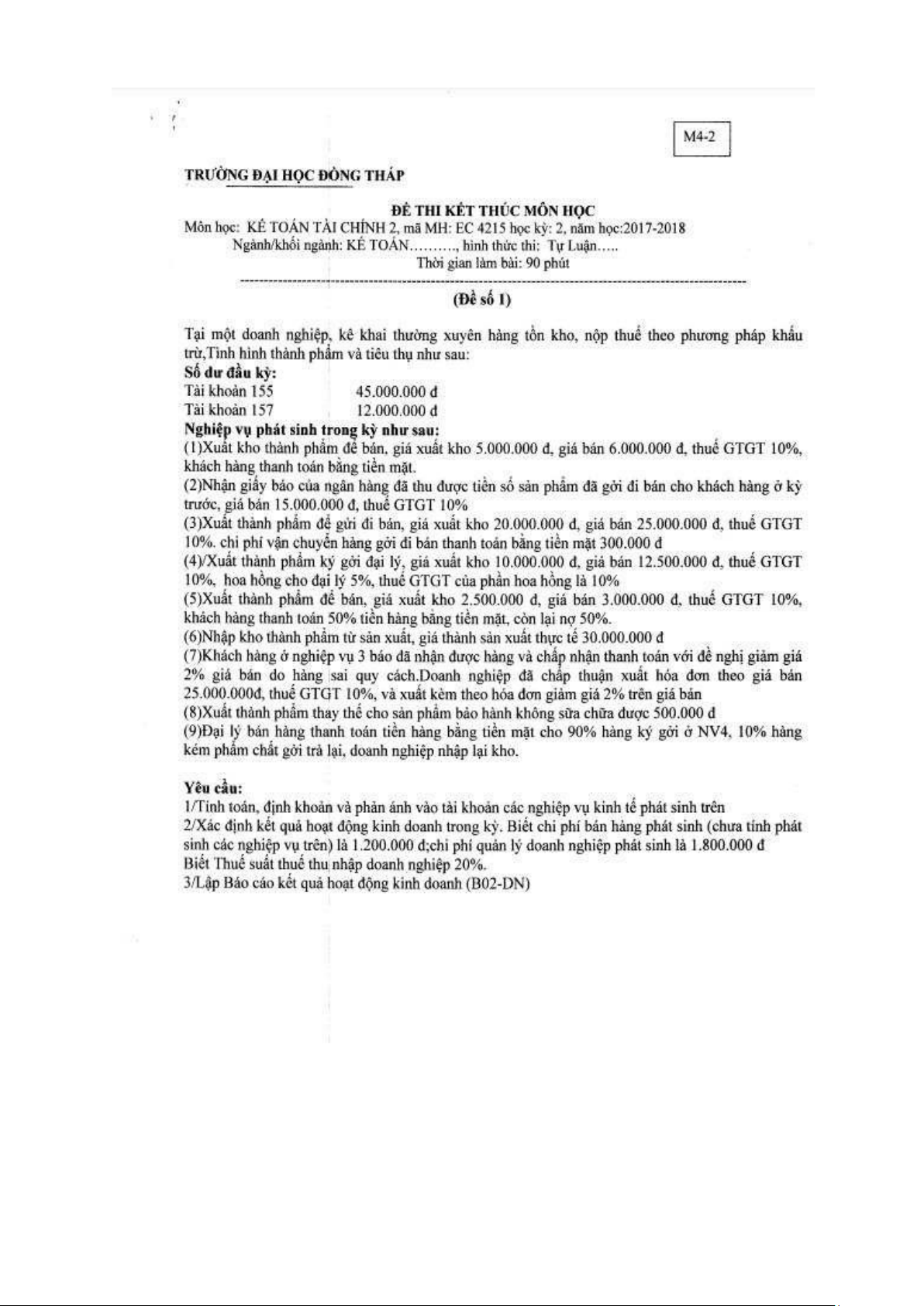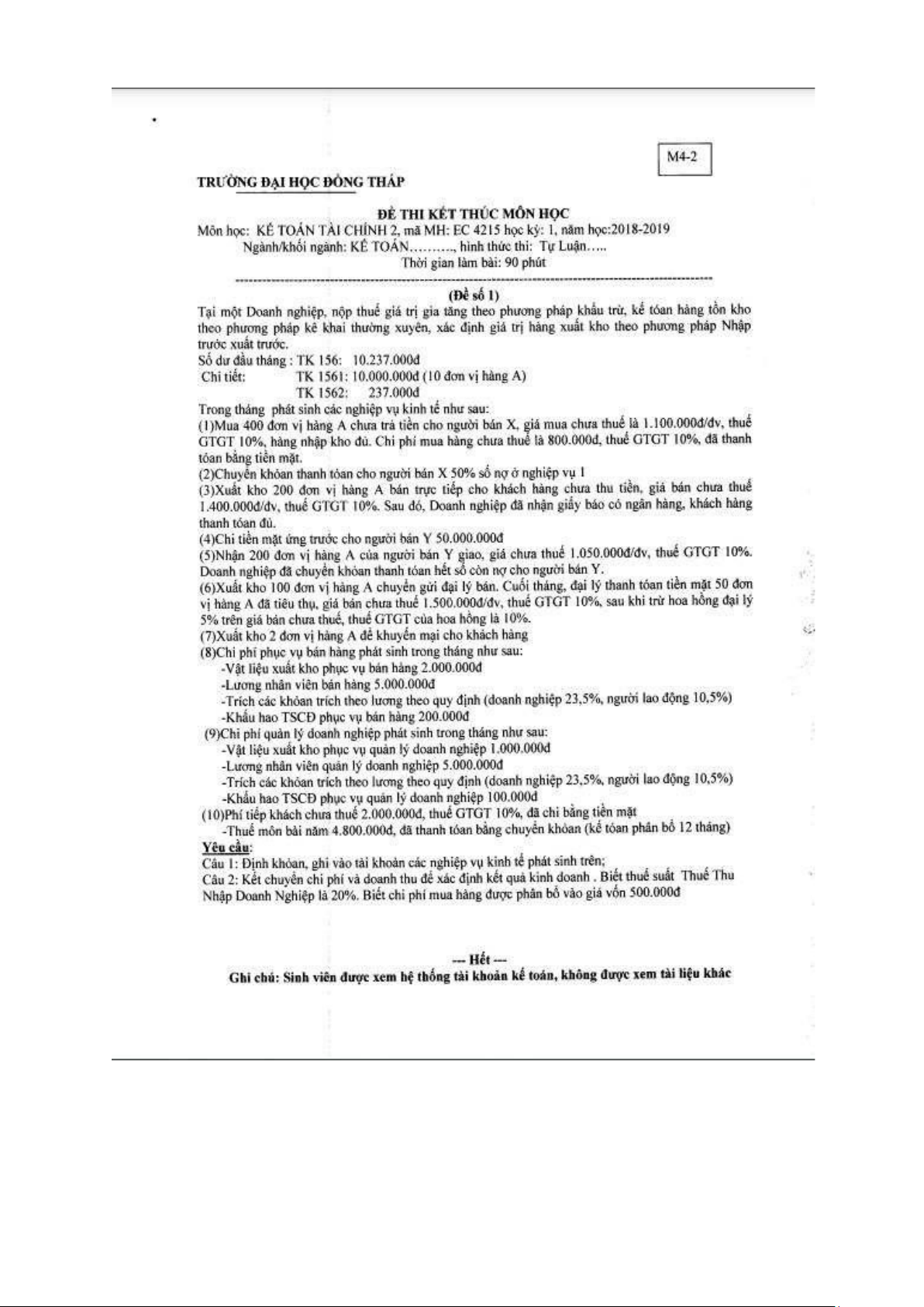 Đề thi kết thúc học phần môn Kế toán tài chính 2 | Đại học Đồng Tháp