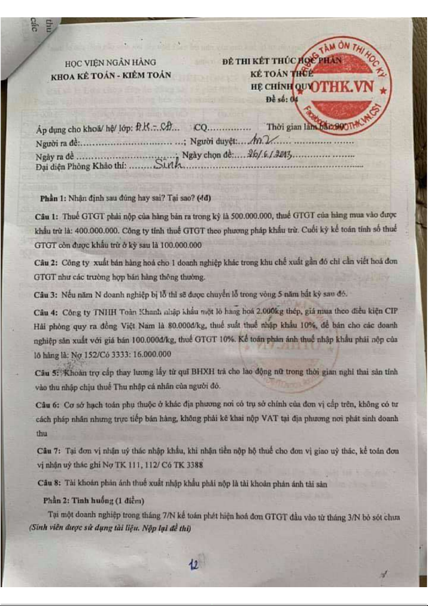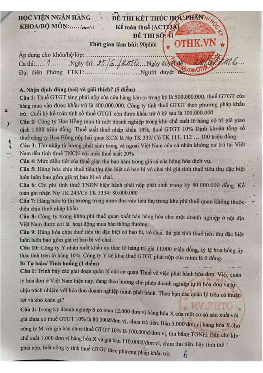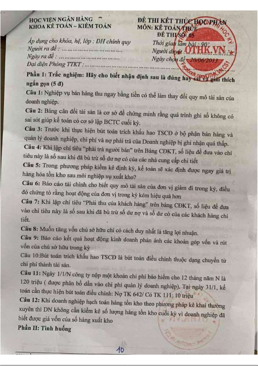 Đề thi kết thúc học phần - Phân tích doanh thu và chi phí môn Kế toán thuế | Học viện Ngân hàng
