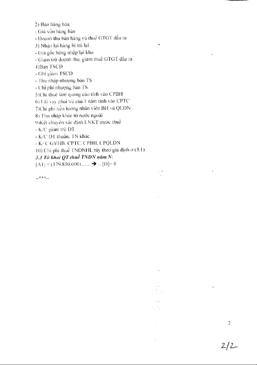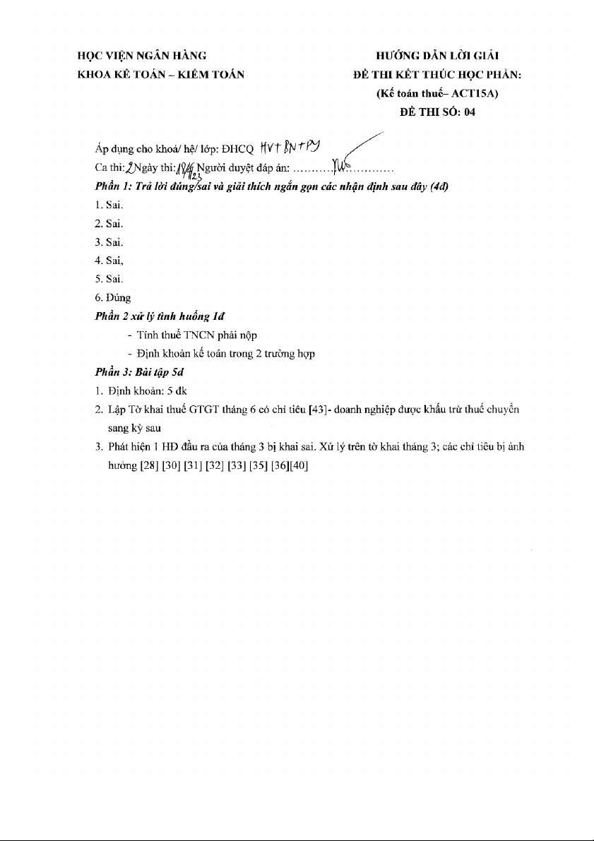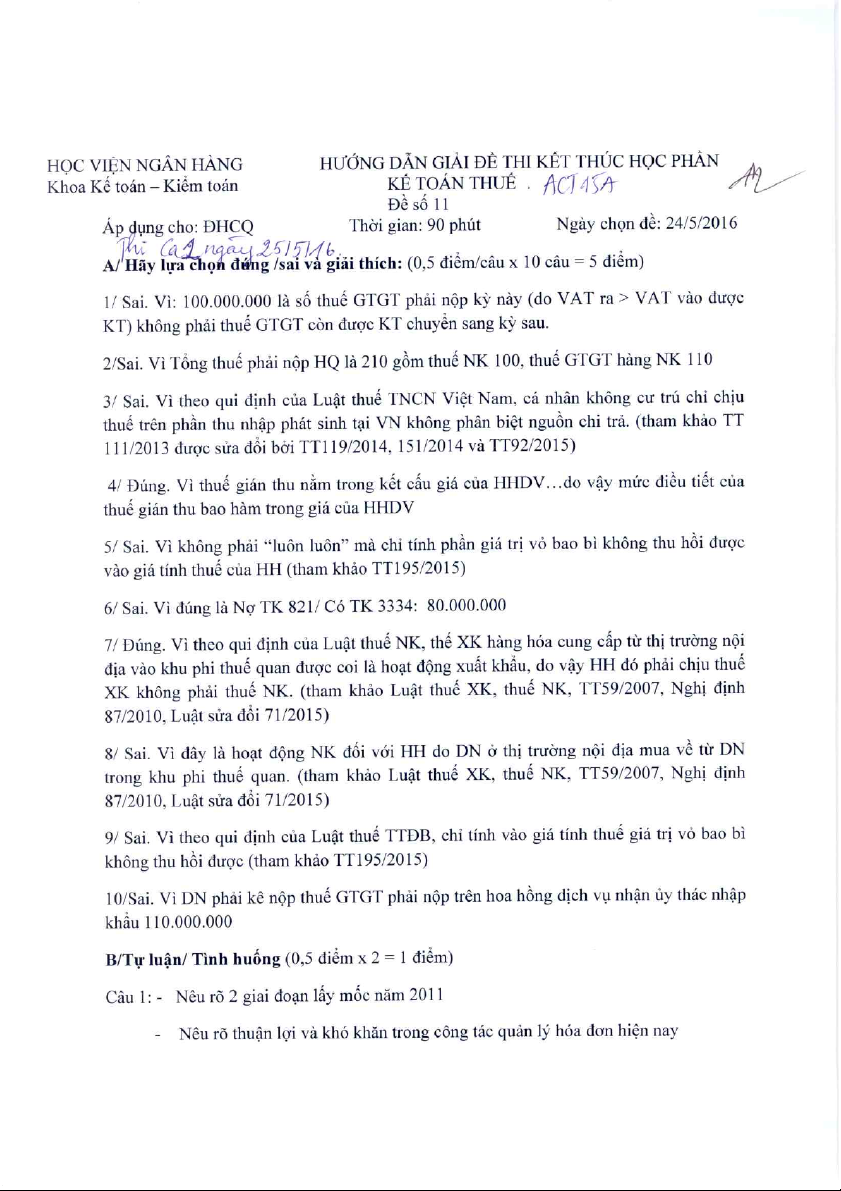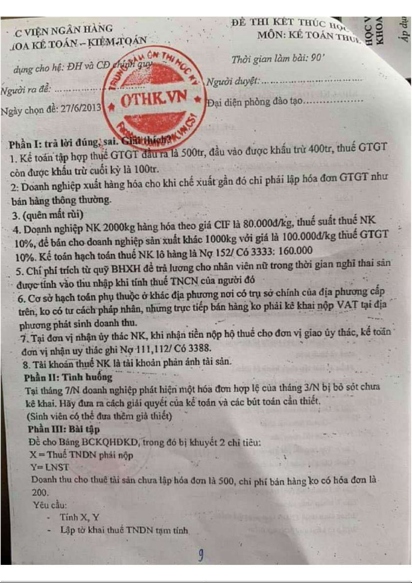 Đề thi kết thúc học phần - Phân tích doanh thu và chi phí môn Kế toán thuế | Học viện Ngân hàng