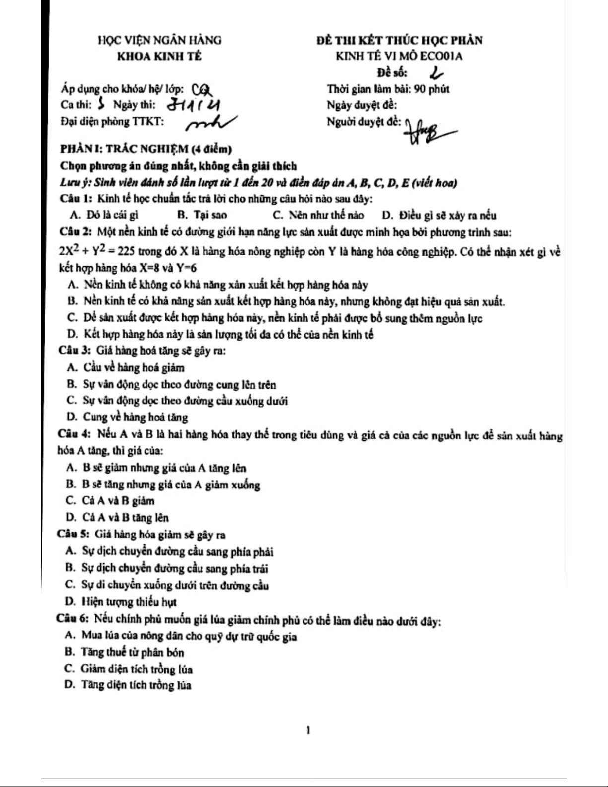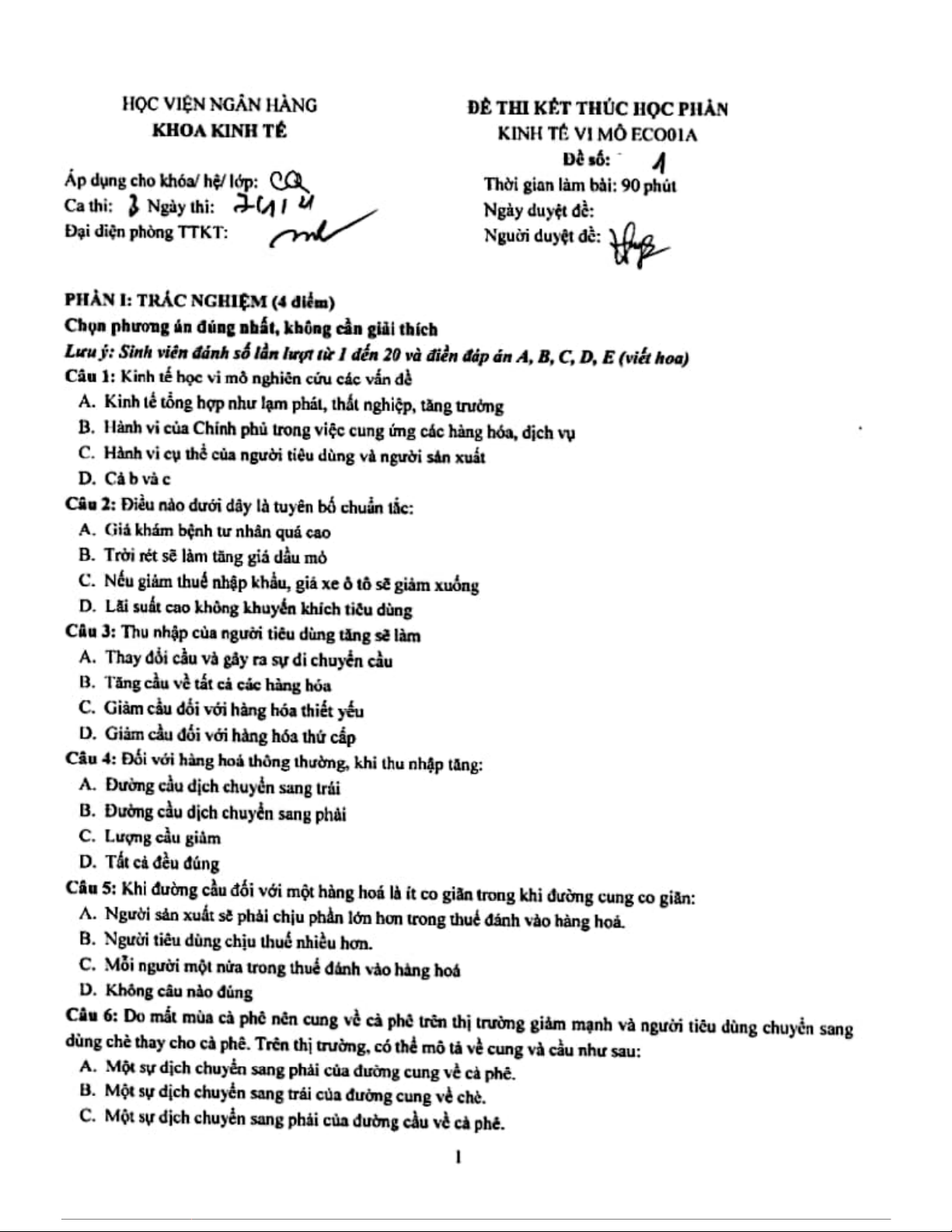Đề thi kết thúc môn Kinh tế vi mô | Học viện Ngân hàng . Tài liệu giúp bạn tham khảo, ôn tập và đạt kết quả cao. Mời đọc đón xem!