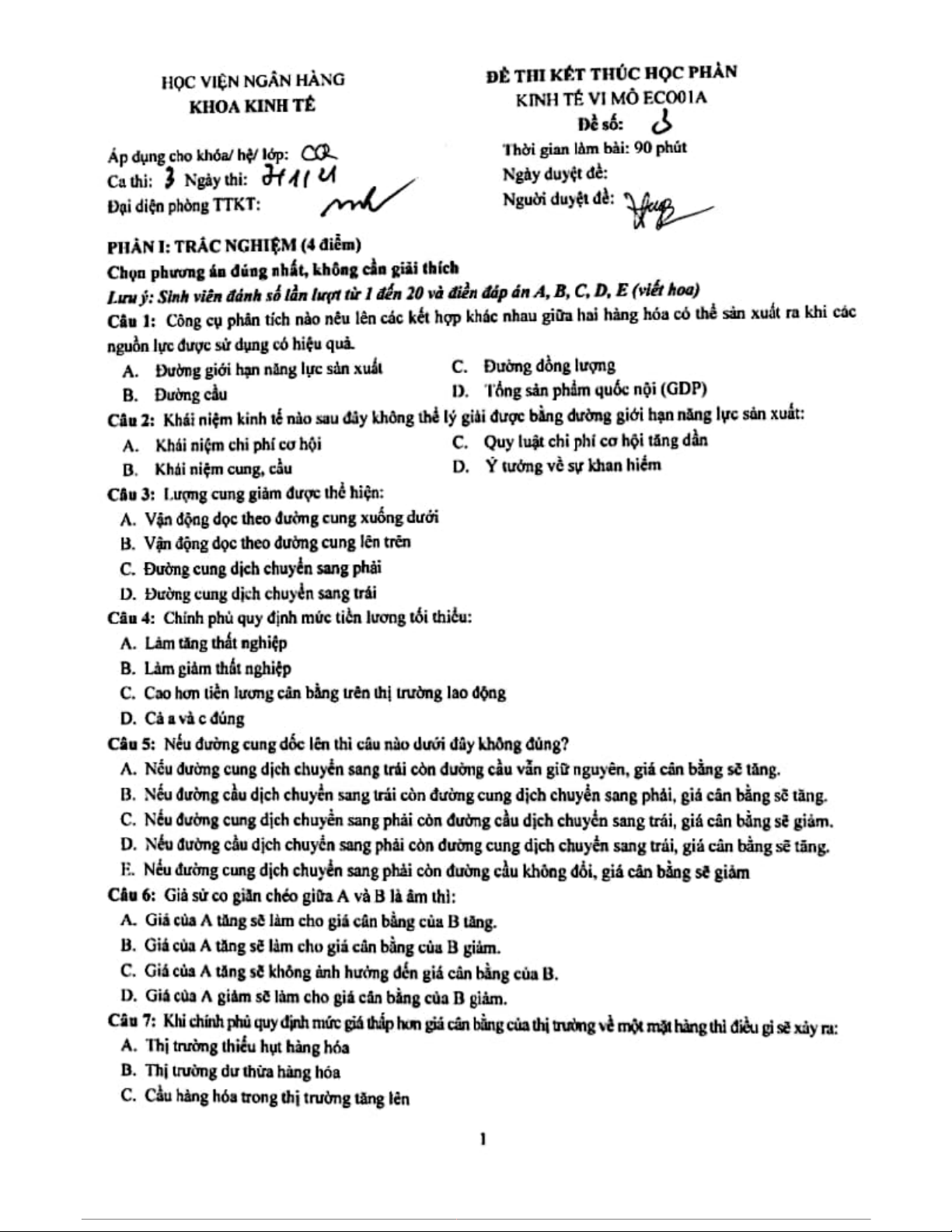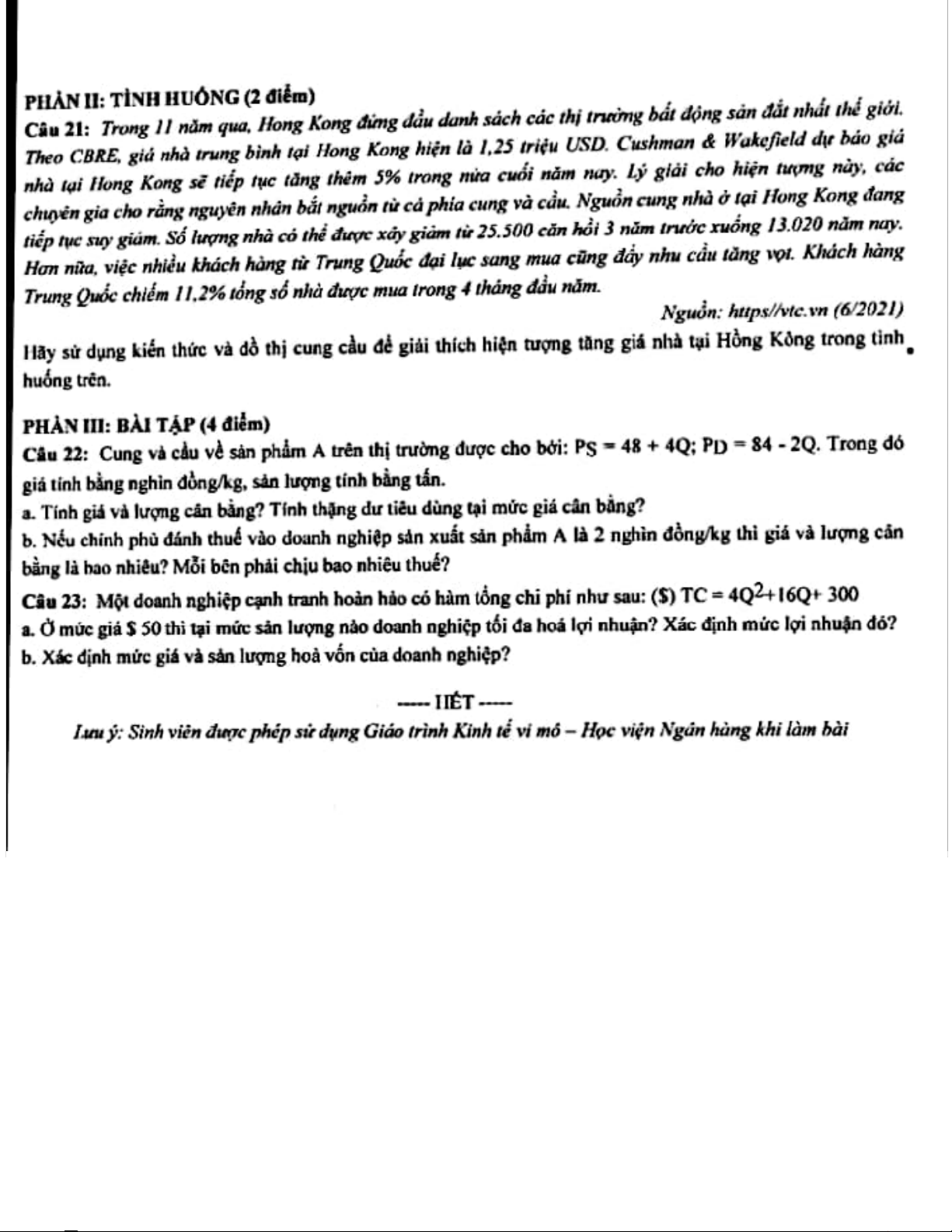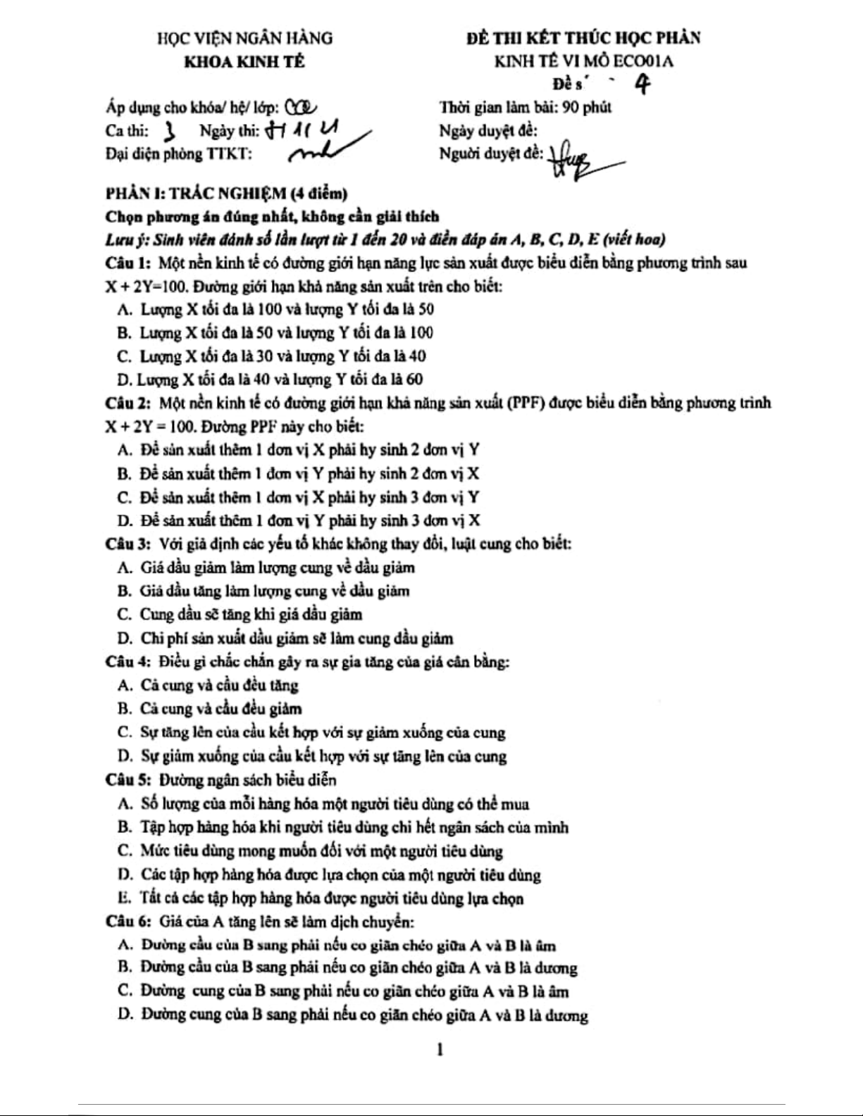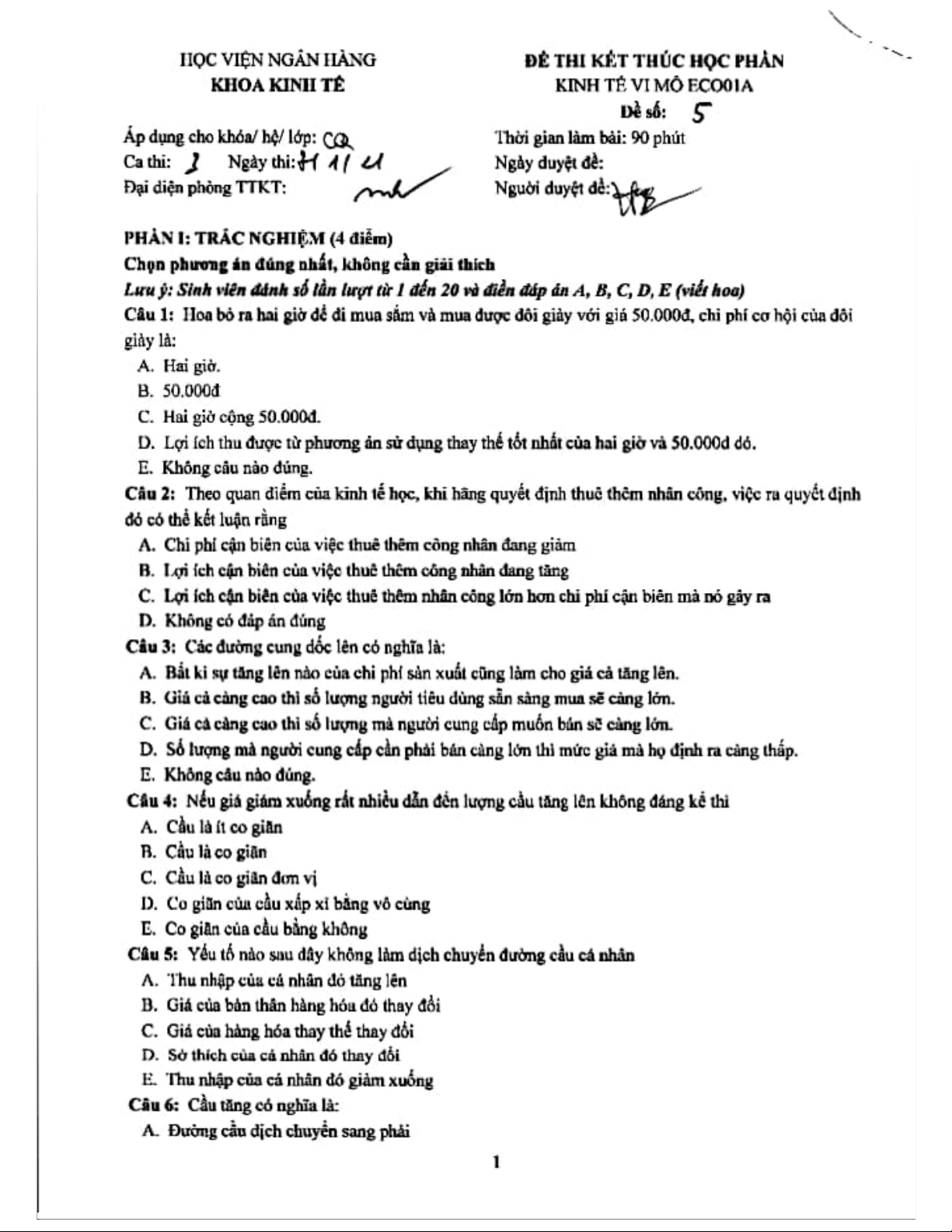 Đề thi kết thúc môn Kinh tế vi mô | Học viện Ngân hàng