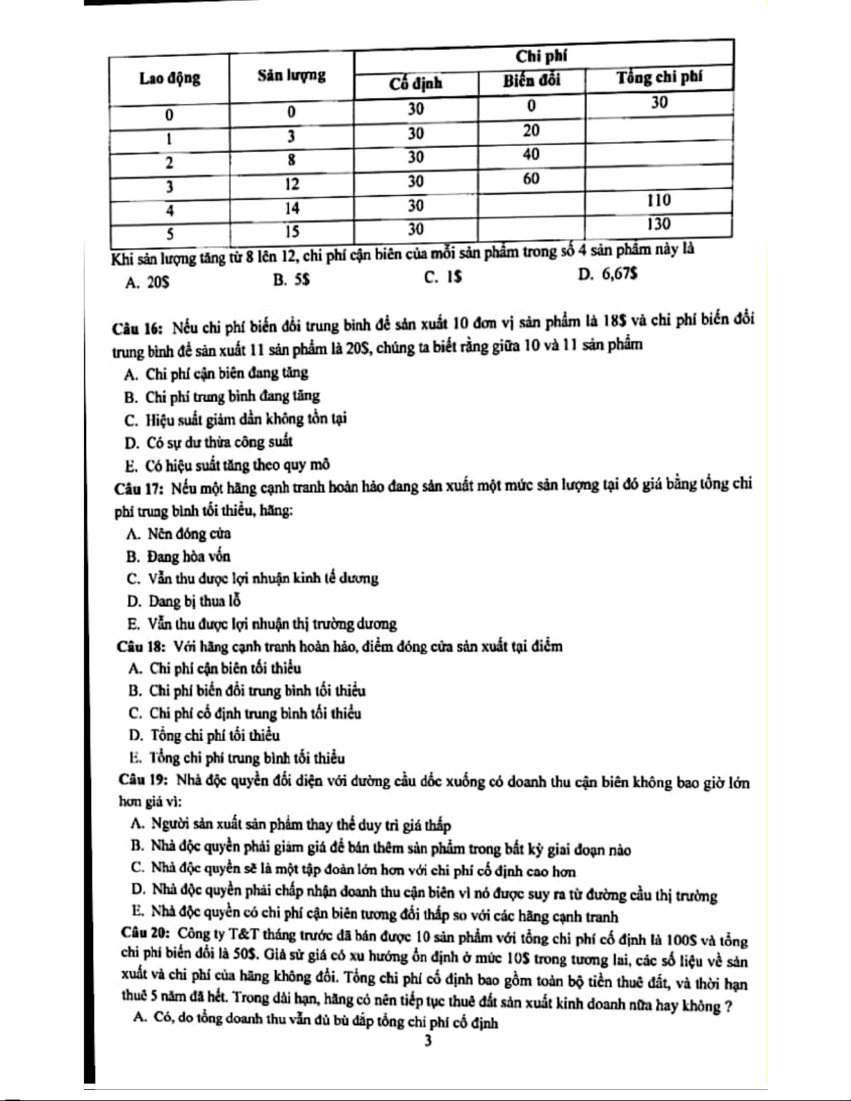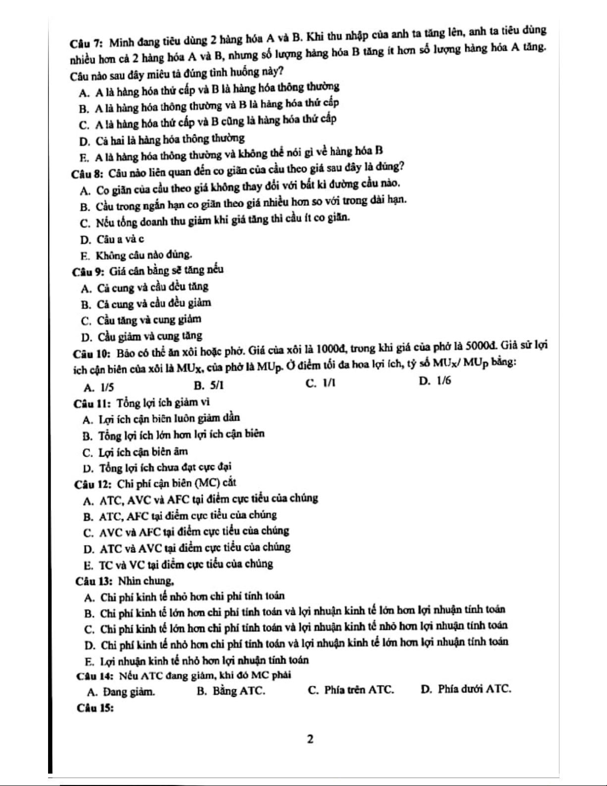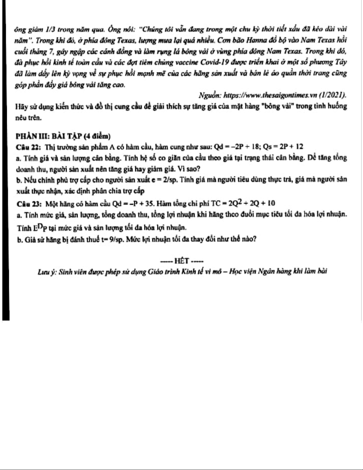 Đề thi kết thúc môn Kinh tế vi mô | Học viện Ngân hàng