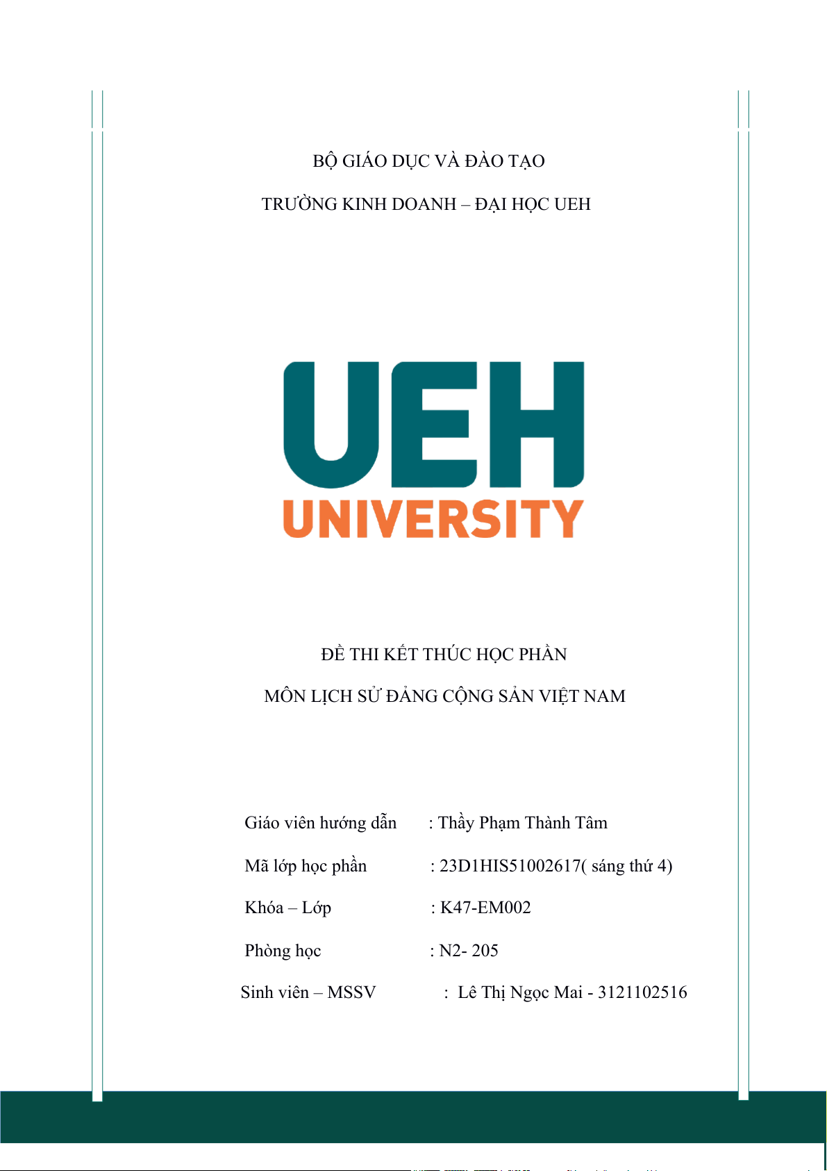 Mã lớp học phần : 23D1HIS51002617( sáng thứ 4) Khóa – Lớp : K47-EM002 Phòng học : N2- 205