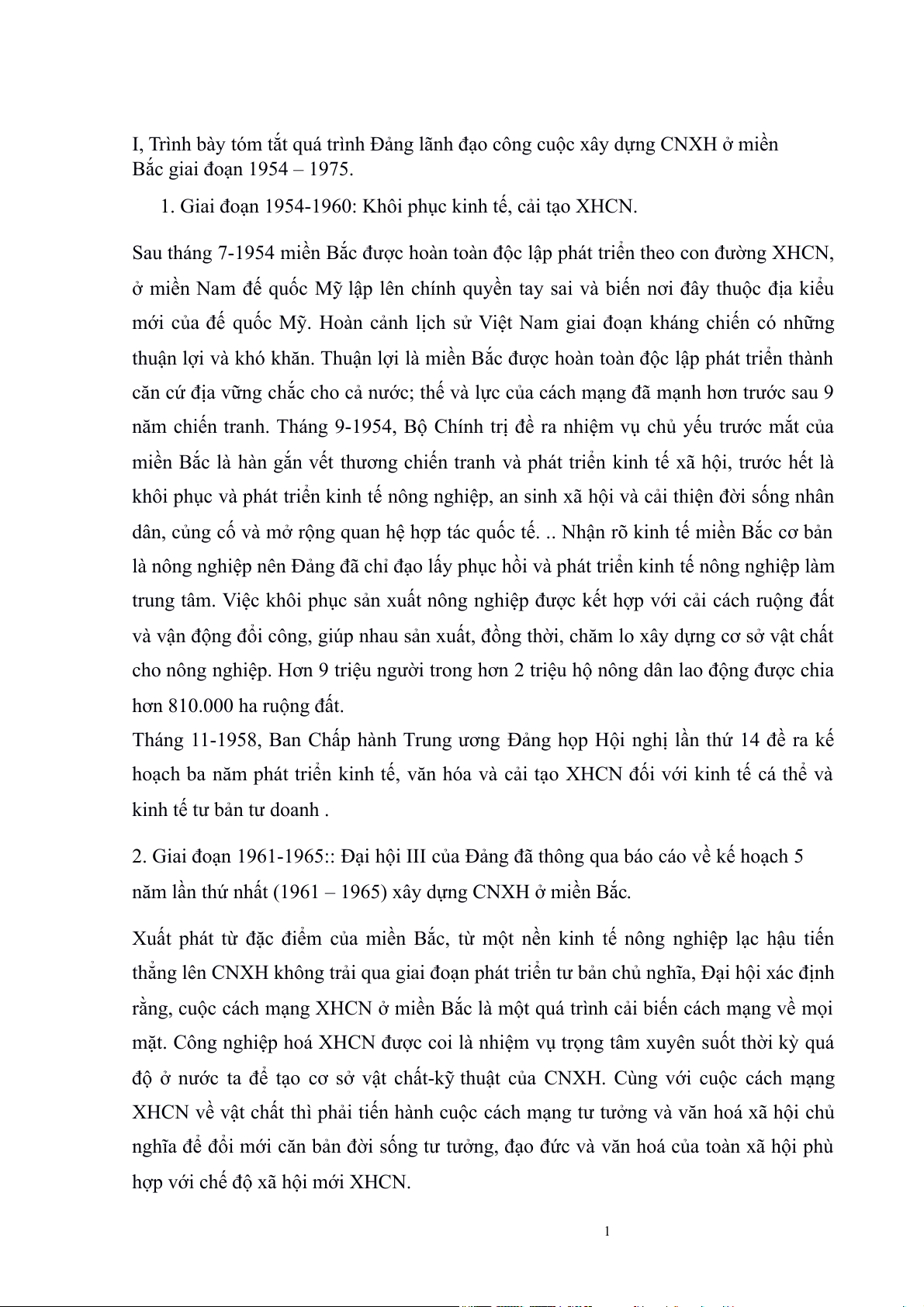I, Trình bày tóm tắt quá trình Đảng lãnh đạo công cuộc xây dựng CNXH ở miền