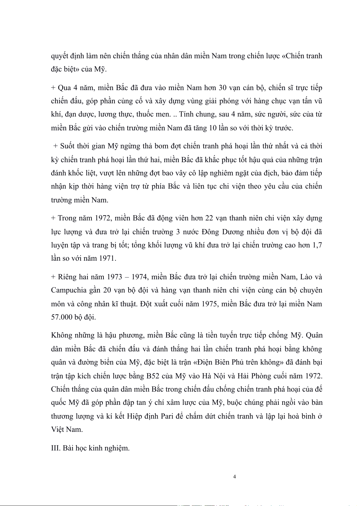 thương lượng và kí kết Hiệp định Pari để chấm dứt chiến tranh và lập lại hoà bình ở Việt Nam. III. Bài học kinh nghiệm. 4