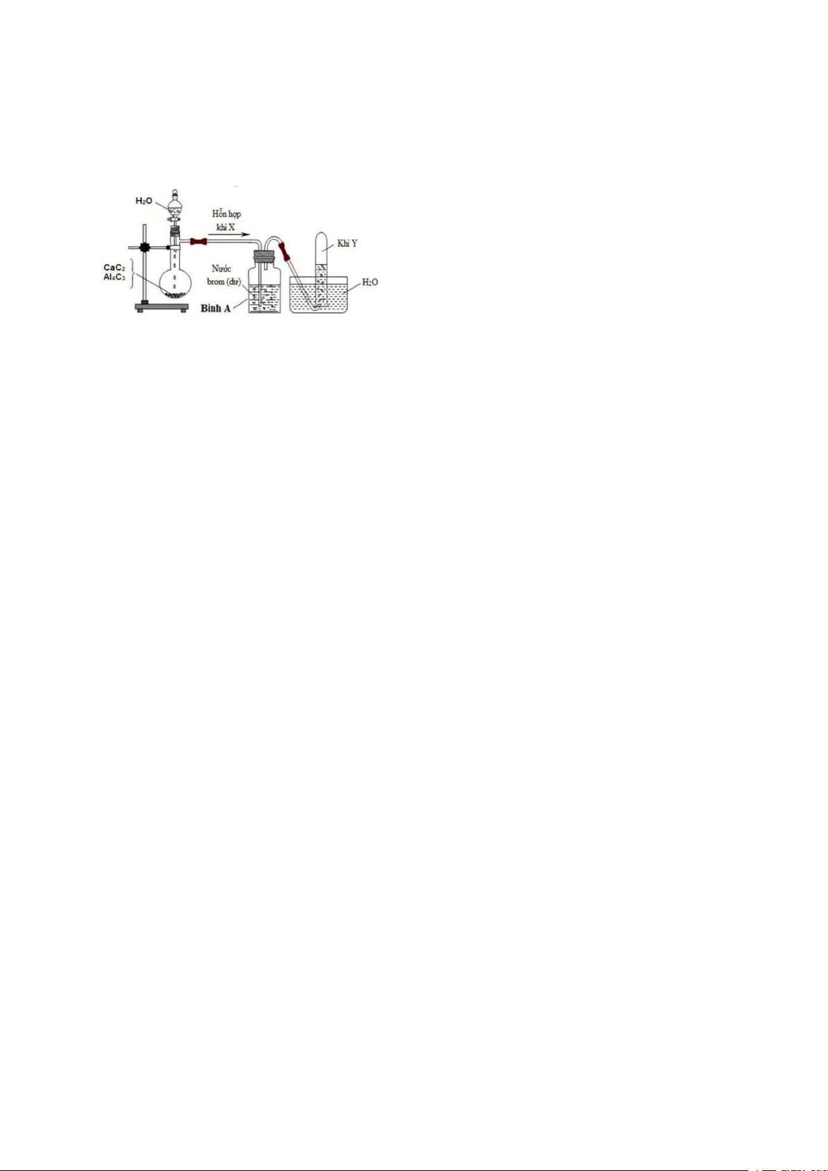Câu 28: Hình vẽ sau đây mô tả thí nghiệm điều chế khí Y từ hỗn hợp rắn gồm CaC2 và Al4C3: Khí Y là A. C2H2. B. C2H6. C. CH4. D. C2H4.