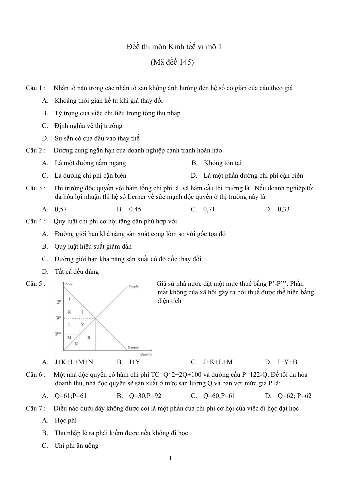 Đềề thi môn Kinh tềế vi mô 1 (Mã đềề 145)