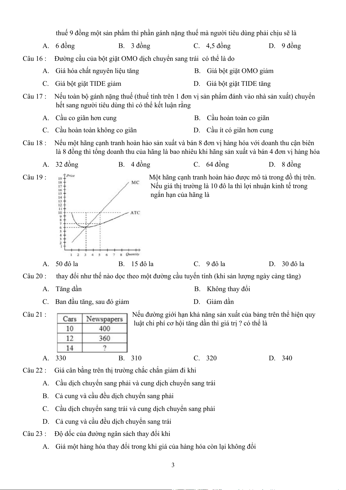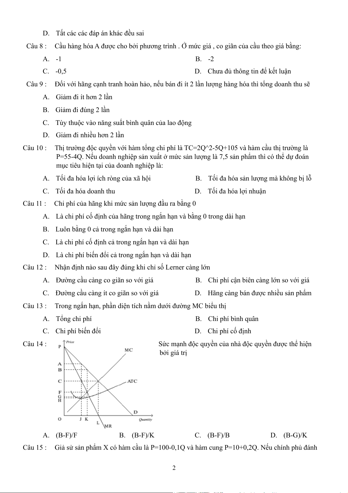 Câu 13 : Trong ngắn hạn, phần diện tích nằm dưới đường MC biểu thị A. Tổng chi phí B. Chi phí bình quân C. Chi phí biến đổi D. Chi phí cố định Câu 14 :