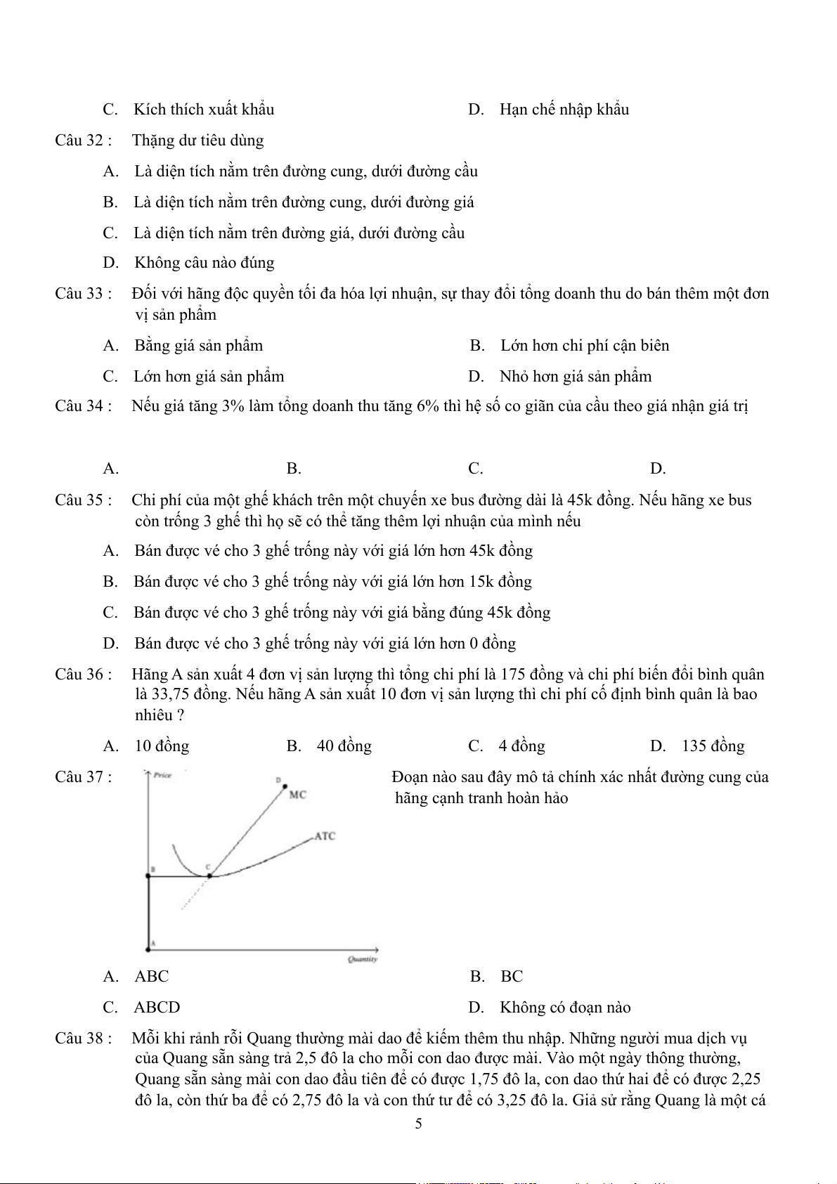 Câu 36 : Hãng A sản xuất 4 đơn vị sản lượng thì tổng chi phí là 175 đồng và chi phí biến đổi bình quân
