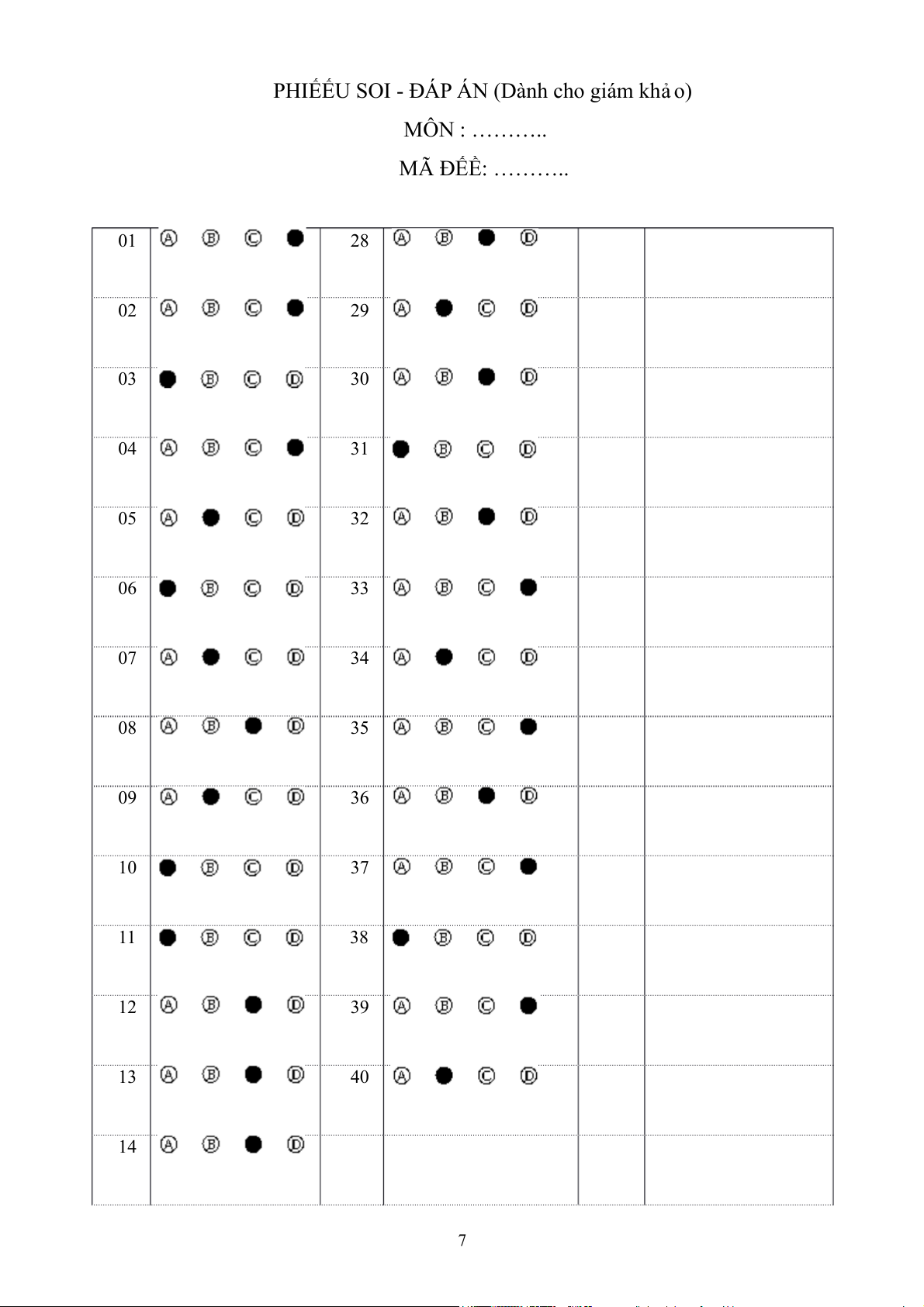 PHIẾẾU SOI - ĐÁP ÁN (Dành cho giám khả o) MÔN : ……….. MÃ ĐẾỀ: ……….. 01 28 02 29 03 30 04 31 05 32 06 33 07 34 08 35 09 36 10 37 11 38 12 39 13 40 14 7 15 16 17 18 19 20 21 22 23 24 25 26 27 8