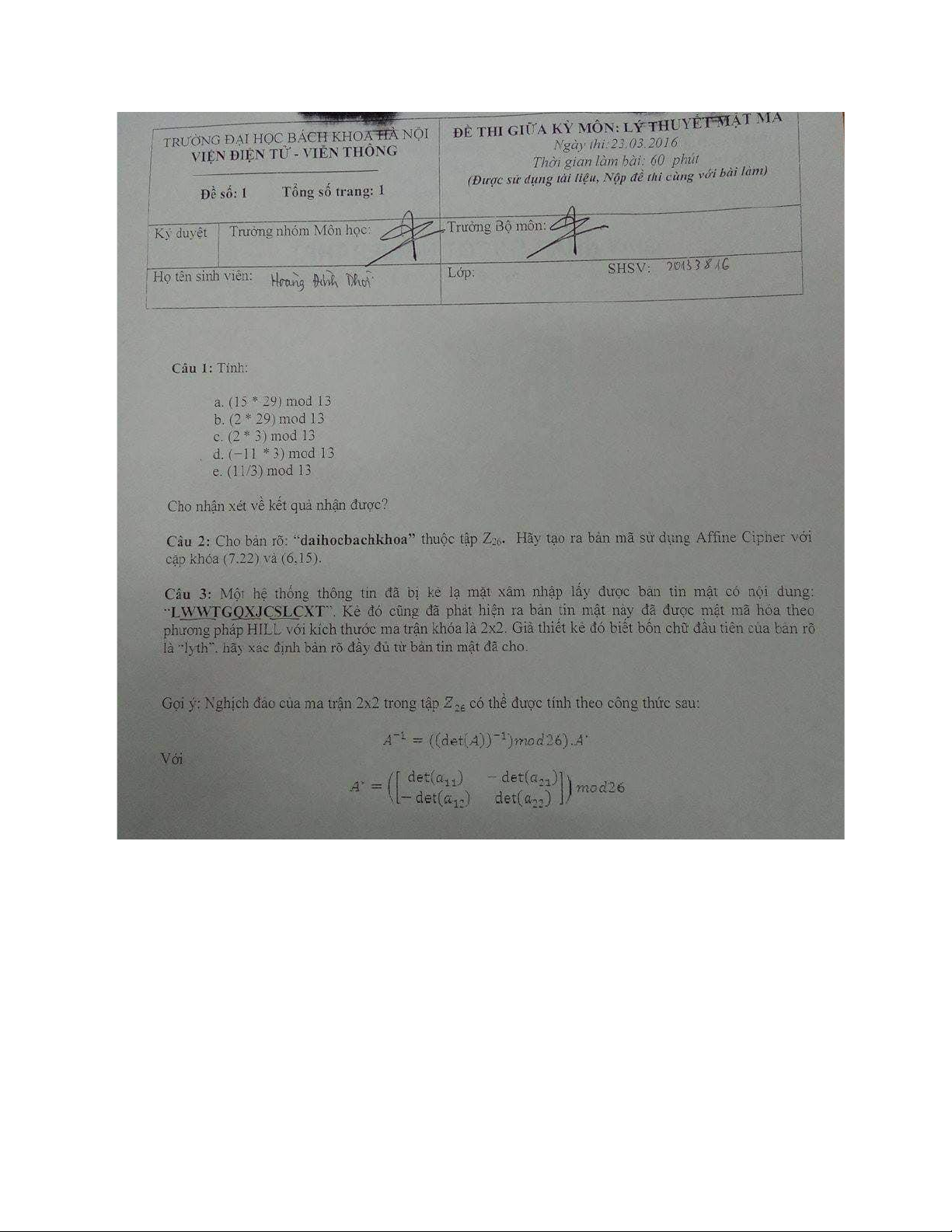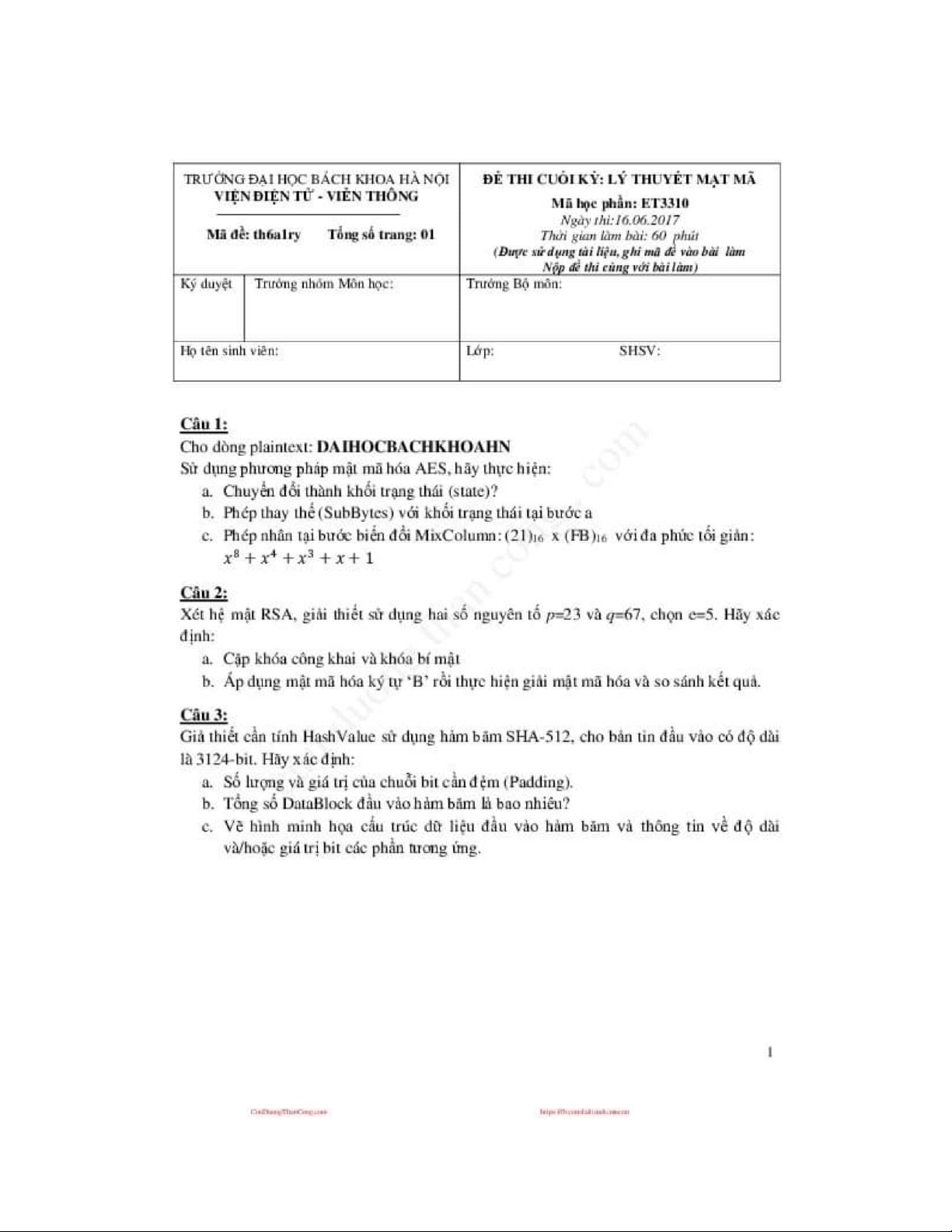 Đề thi Môn Lý thuyết mật mã | Đại học Bách Khoa Hà Nội