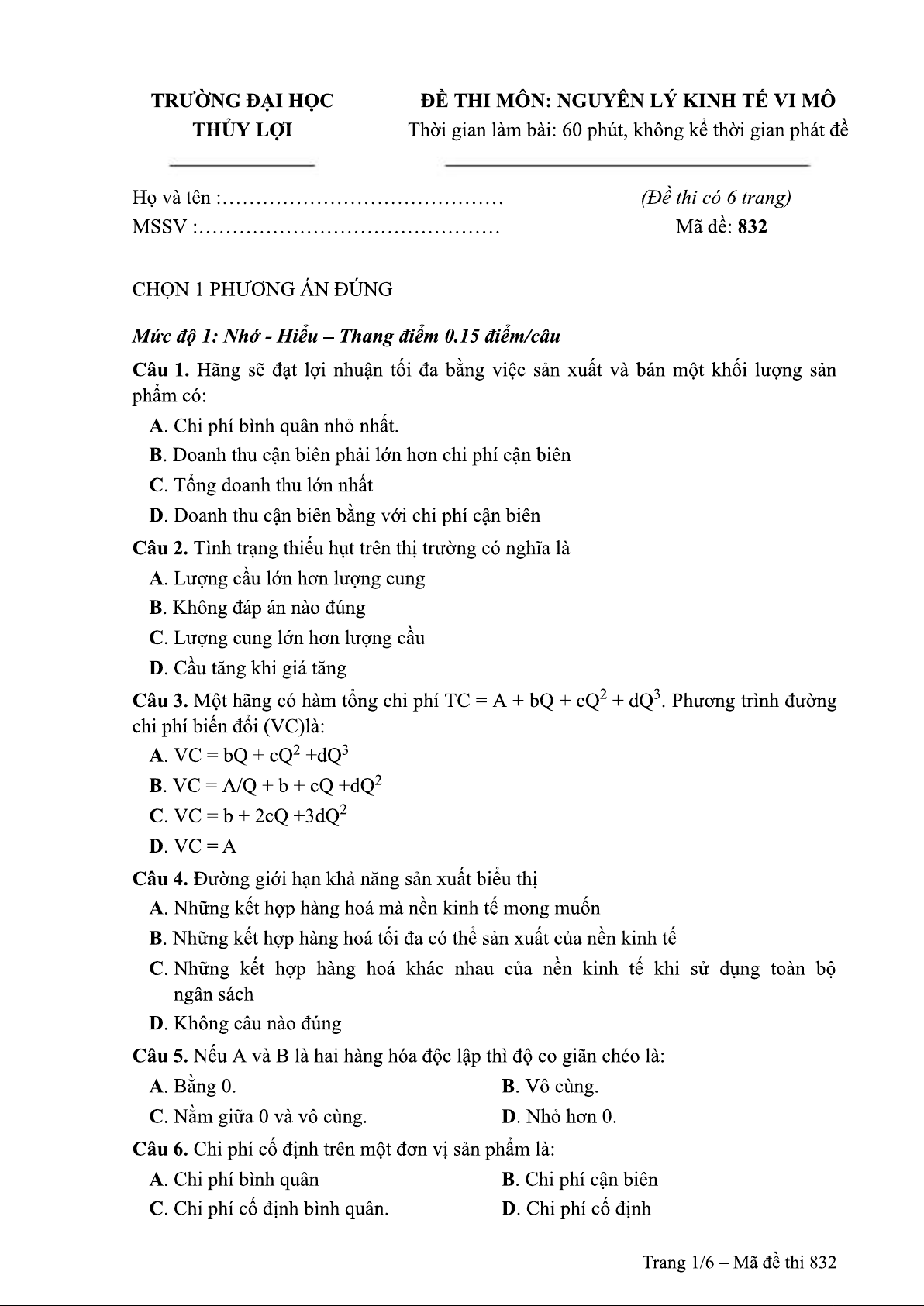 Đề thi môn nguyên lý kinh tế vi mô - Đề 832 | Trường Đại học Thủy Lợi. Tài liệu giúp bạn tham khảo, ôn tập và đạt kết quả cao. Mời đọc đón xem!