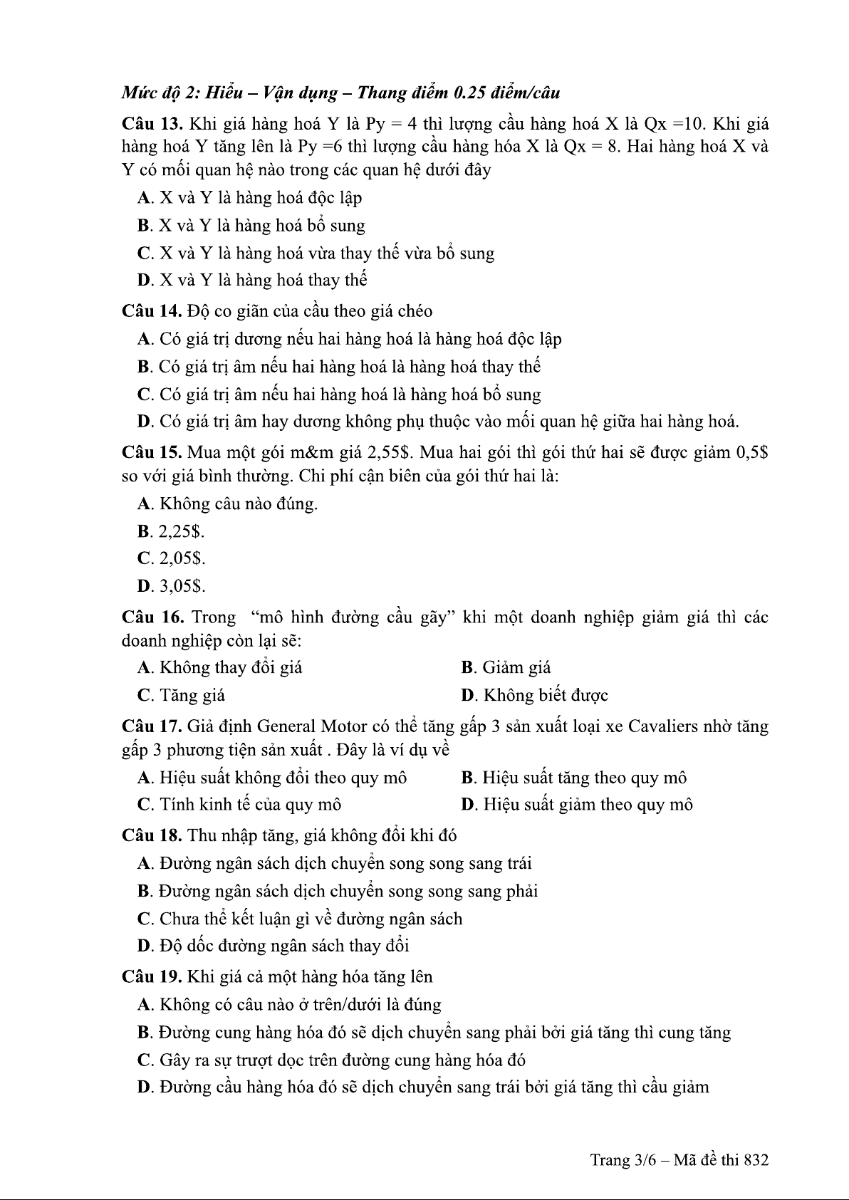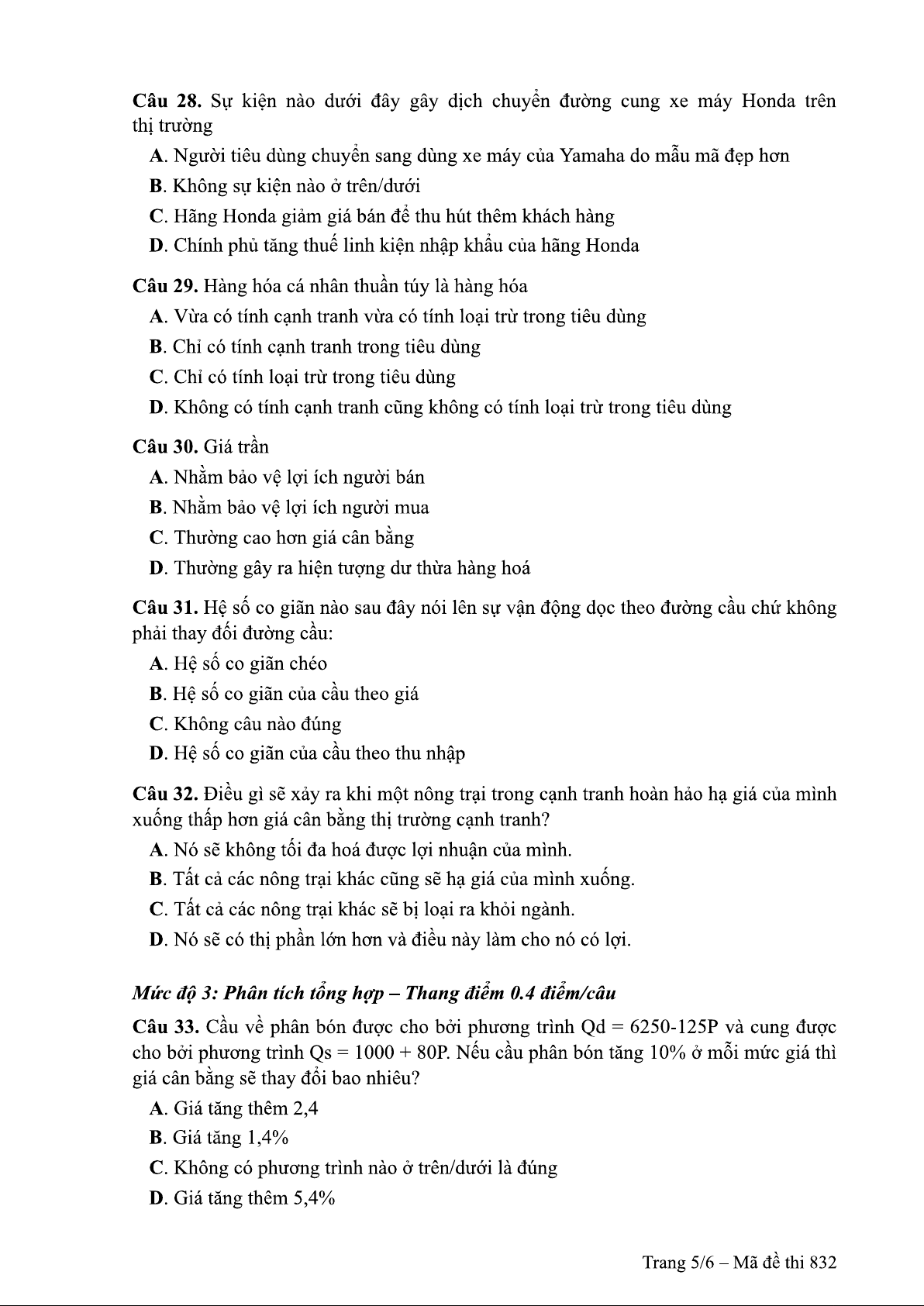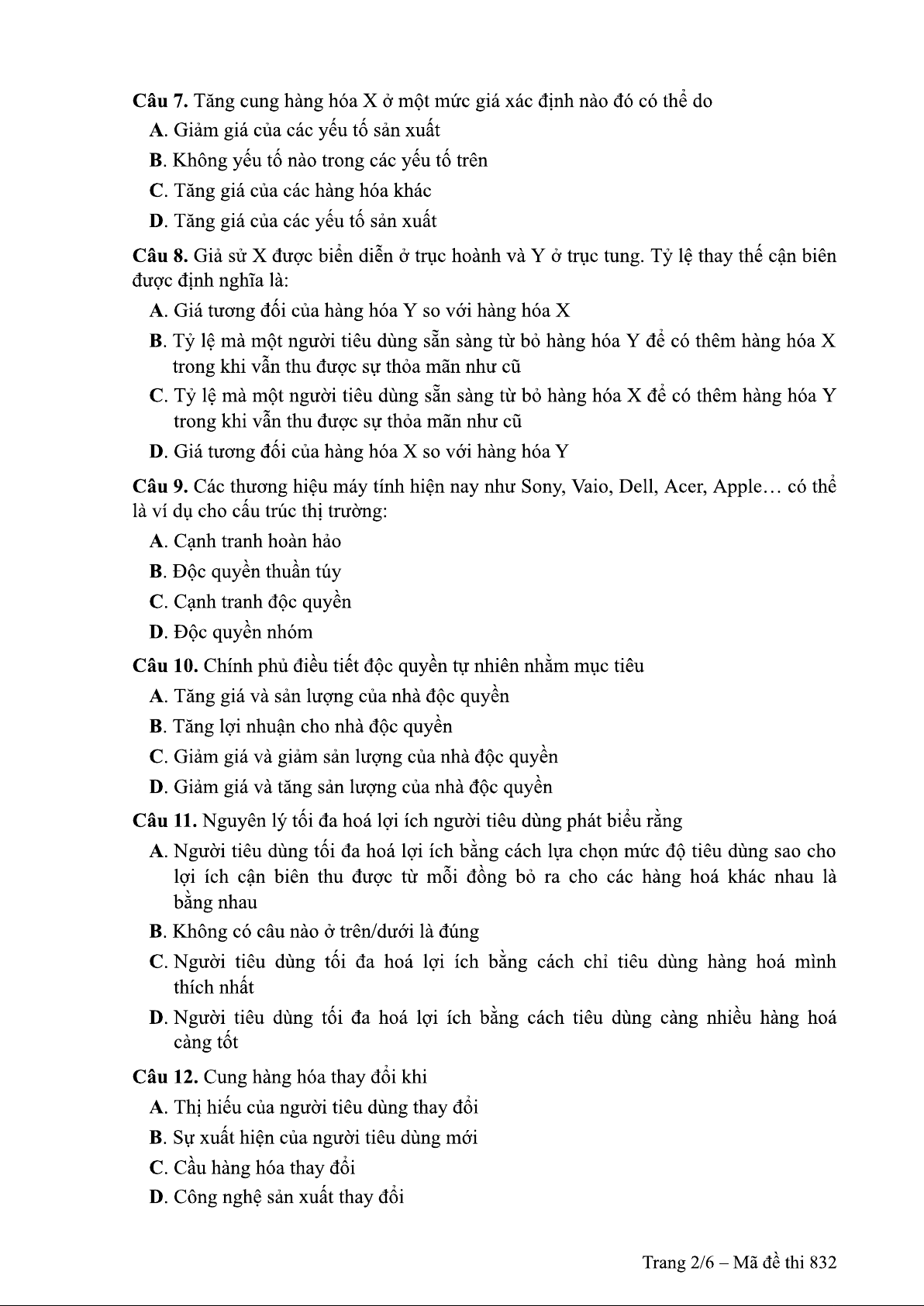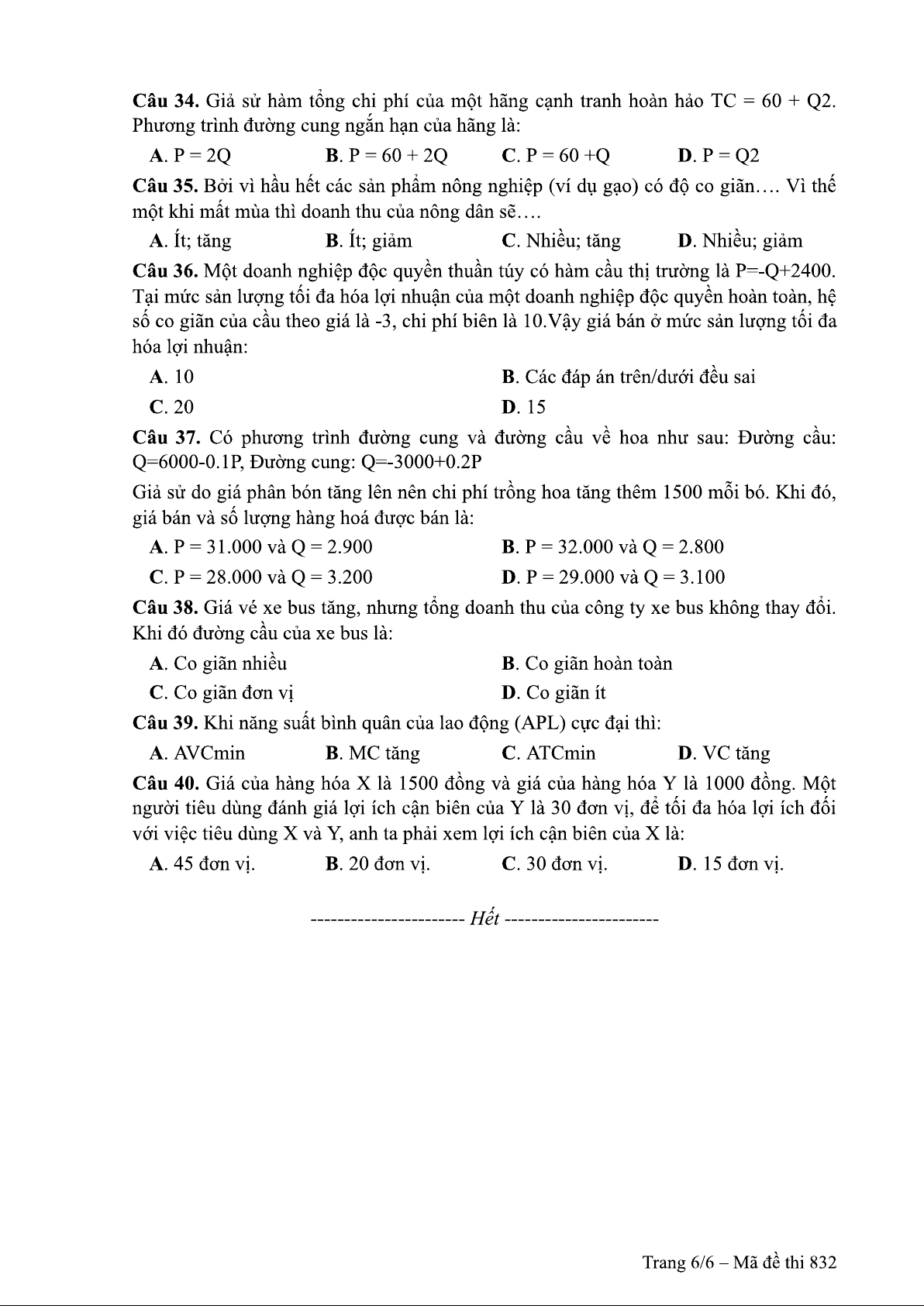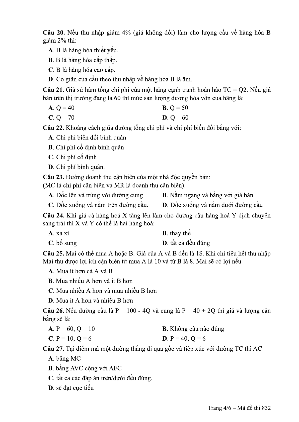 Đề thi môn nguyên lý kinh tế vi mô - Đề 832 | Trường Đại học Thủy Lợi
