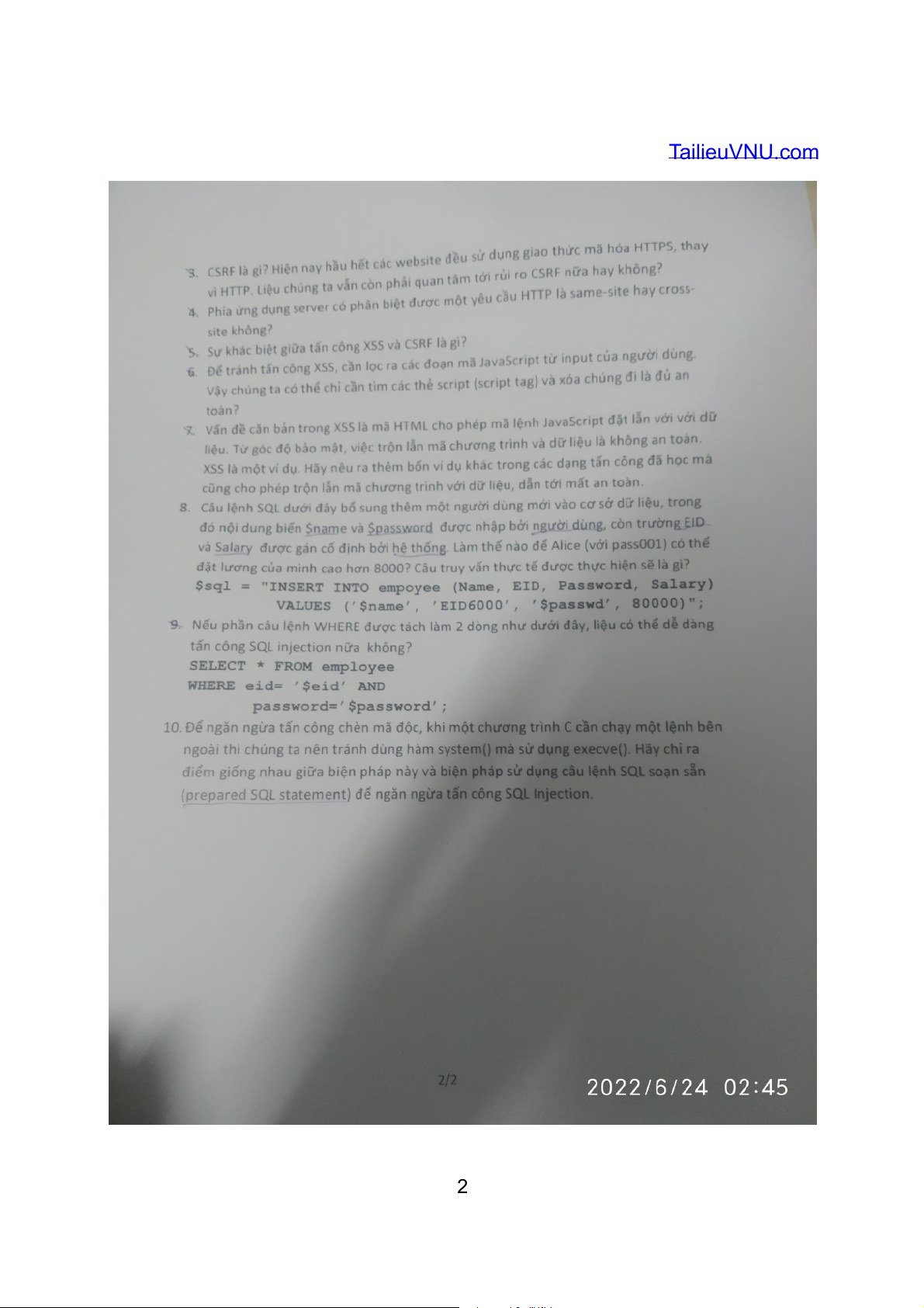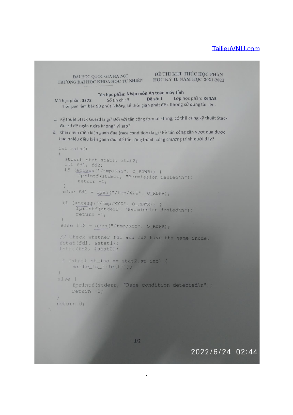 Đề thi Nhập môn An toàn máy tính | Nhập môn An toàn máy tính | Trường Đại học Khoa học Tự nhiên, Đại học Quốc gia Hà Nội